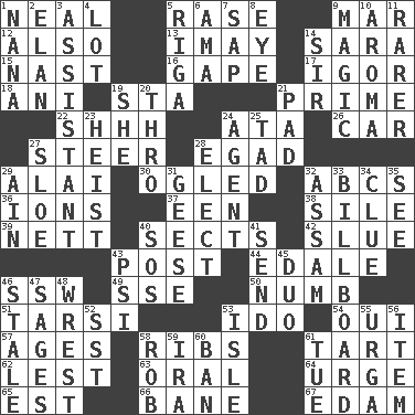 ACROSS 1. Anneal 5. Raze (variant) 9. Impair 12. In addition 13. "If ____ say so..." 14. "Two Mules for Sister ____" 15. Political cartoonist Thomas 16. Open wide 17. Composer Stravinsky 18. Cuckoo 19. R.R. building 21. A-one 22. Quiet! 24. "One Day ___ Time" 26. 4-wheeled motor vehicle 27. Bull 28. Mild oath 29. Mountain range southwest of Kyrgyzstan 30. Stared 32. Lettered men learn these first 36. Charged particles 37. Car or cant ending 38. Drop; flow; fall 39. Remaining after all deductions 40. Religious groups 42. Turn sharply 43. Mail 44. Peak District village in England 46. Compass dir. 49. Compass dir. 50. Unfeeling 51. Tarsus (plural) 53. Wedding promise 54. Fr. "Yes" 57. Eons 58. Chest bones 61. Small pie 62. For fear that 63. Spoken 64. Goad 65. Eastern Standard Time (abbr.) 66. Object of repulsion 67. Dutch treat DOWN 1. Nanny 2. Enthusiasm 3. Helper 4. Car dealer's back yard 5. Capital of Latvia 6. Housemaid (var.) 7. Plant excrement 8. Sight organ 9. Mysterious quality of enchantment 10. Odor 11. More valued for its uncommonness 14. Title for a knight 19. A female animal or person 20. Through, poetically 21. Groovy apt. 23. Robbery 24. Representative 25. Small boy 27. _ gin 28. Voters do this 29. The 18th letter of the Arabic alphabet 31. Honkers 32. Indian state 33. Big road sign 34. A slight indication 35. Observe 40. Distress signal 41. Transmit 43. 23rd letter of the Greek alphabet 45. Superhero pair 46. Lacking originality or spontaneity 47. Gurus 48. Obtain by seizing forcibly or violently 52. Fast jet (abbr.) 53. Capri or Wright 55. Capital and largest city of Mongolia 56. Detail 58. Director Reiner 59. Retirement account (abbr.) 60. Forbid 61. Third day of the wk.