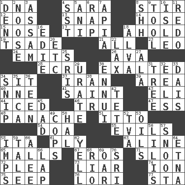 ACROSS 1. Heredity factor (abbr.) 4. "Two Mules for Sister ____" 8. Tumult 12. Greek goddess of the dawn 13. Fastener 14. Stockings 15. Olfactory organ 17. Native american tent (variation) 18. Hold, grip (Informal) 19. Sadhe (variant) 21. 100% 23. Lion 24. Gives off 26. Actress Gardner 28. Shade of tan 30. Glorified 34. Be seated 37. SW Asia republic 39. Type of rug 40. Compass dir. 41. Virtuous person 43. Biblical high priest 44. On the rocks 46. Loyal 47. Curvy letter 48. Flamboyance 51. "Tell ____ the Marines!" 54. ___ good deed 55. Vices 58. Call ___ day 61. Apply oneself diligently 63. Place in a line 65. Promenades 67. Greek god of love 71. Notch 72. Entreaty 73. One who doesn't tell the truth 74. Electrically charged atom 75. Ooze 76. Australian parrot (variant) 77. R.R. building DOWN 1. Scratch 2. Trap for birds or small mammals 3. Indian state 4. Fast jet (abbr.) 5. Black tropical American cuckoo 6. Reproach for some lapse or misdeed 7. Capital of Western Samoa 8. Quiet! 9. Instrument 10. Small island 11. Make new 16. Singer Brickell 18. Inventor's middle name 20. And so on (abbr.) 22. Not strict 25. Indian titles of respect 27. Wing 29. A salt of uric acid 30. World-weariness 31. Family _ (genealogy) 32. Snakelike fish 33. Raised platform 34. Sever or remove by pinching or nipping 35. South American Indian 36. Adolescent 38. Atmosphere 42. Wig 45. Male parent 49. 911 reaches them 50. Actor Linden 52. Federal power corp. 53. Petroleums 56. Ms. Damita and namesakes 57. Snout, nose 58. Naughty children 59. Lie 60. Toward shelter 62. Shout 64. Inactive volcano in Sicily 66. Pet locale 68. _ de Janeiro 69. Rowing implement 70. Indian title of respect (Mr.)