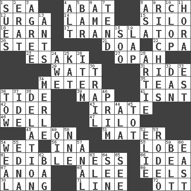 ACROSS 1. Ocean 4. Blind as ____ 8. Bowlike part 12. Capital and largest city of Mongolia 14. Unable to walk 15. Grain storage tower 16. Merit 17. Interpreter 20. Proofreading order 21. ___ good deed 22. Numbers guy (abbr.) 23. 1973 Nobel Price Winner (Physics) Leo 27. Brightly colored fish 29. Electrical Unit 31. Travel on or in a vehicle 34. Distance measurement 35. Beverages made from leaves 36. Event that recurs at intervals 39. Atlas unit 41. Is not 42. Baltic tributary 43. Feeling or showing extreme anger 46. Not ill 47. _ and Stitch 48. A really long time 51. Mother 54. Soggy 56. _ tizzy (2 wds.) 58. Ear part 61. The property of being fit to eat 66. It may be bright or harebrained 67. Small Philippine buffalo 68. Toward shelter 69. Snakelike fish 70. Long (Scottish) 71. Actor's bit 72. Baseball player Mel DOWN 1. Institutes legal proceedings 2. Part of Q.E.F. 3. Match 4. The first octave above the treble staff 5. Long, evenly shaped piece 6. Housemaid (var.) 7. Be inclined (to) 8. White ___ sheet 9. Actors Guy, Robert Welles, and Clint 10. Hoof sound 11. Israeli folk dance 13. Pismires 18. "Barney Miller" actor Jack 19. Pet locale 24. Deep reverence 25. Krazy ___ of comics 26. Detail 28. Nick name for Arthur 30. Hang back 32. One of the 12 tribes of Israel 33. Eastern Standard Time (abbr.) 34. Haggard of country music 36. Pull behind 37. Binary compound 38. Conveyance 40. Demure 44. Chicken ___ king 45. Small child 49. Lubricate 50. Compass dir. 52. Writer Wiesel 53. Cowboy competition 54. Welt 55. Pulitzer Prize-winning author Ferber 57. Of or related to the anus 59. Waist strap 60. 90 degrees 62. Container for groceries 63. Biblical high priest 64. Elected rep. 65. Perceive with the eye