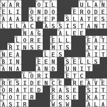 ACROSS 1. Armed conflict 4. Petroleum 7. ____ Bator, Mongolia 11. Connecticut Ivy Leaguer 12. Southwest Nigerian state 13. Wear away 14. Auto club (abbr.) 15. Ooze 16. Chalkboards 17. Pale purple color 19. Helper 21. Tired old horse 23. Toward shelter 24. Old wives' tales, e.g. 25. Pipe bend 26. Consume 29. Remove soap 30. Mountains (abbr.) 31. 16 32. Teachers' org. 33. French article 34. Small island 35. Storage container 36. Car or cant ending 37. Makes a sale 40. Santa ___, CA 41. Plus 42. A single undivided whole 43. Australian parrot (variant) 45. And so on (abbr.) 46. Home 51. Rob, plunder, or pillage 55. Spoke pompously 56. To erase 58. Be seated 59. Carrier 60. Celtic language 61. Krazy ___ of comics 62. SW Saudi Arabia district 63. Compass dir. 64. Chicken ___ king DOWN 1. Welt 2. Mountain range southwest of Kyrgyzstan 3. Monetary unit of Yemen 4. Single 5. The content of cognition 6. Chops off 7. A salt of uric acid 8. Globular water bottle used in Asia 9. Arabian gulf 10. Egg locale 12. Motion picture awards 13. Otherwise 16. Beverly of Met fame 18. Soon (poet.) 20. Table seasonings 22. Turn to the right 24. Climbing, woody, usually tropical vines 25. Make improvements or corrections to 26. Honor 27. Opinion 28. Teat (slang) 29. It's straight from the horse's mouth 32. Basketball assoc. 33. Soviet premier 1918-24 36. Having ears or earlike features 37. Institute legal proceedings 38. Main course 39. Louse (plural) 43. 61 cubic inches 44. River in Europe 46. Roll call or roster of names 47. Greek god of love 48. Suttee (variant) 49. Ship's personnel 50. Hearing organs 52. "____ silly question..." 53. Small bottle 54. Singer James 57. Compass dir.