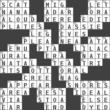 ACROSS 1. Scram, to a cat 5. Russian fighter aircraft 8. Allow 11. Grandmother 12. The sixth month of the Jewish calendar 14. Mouth or opening 15. Verbally 17. We are 18. Prepare for publication 19. Food holders 21. Hyrax 23. Part of a journey 25. Nights before holidays 26. Entreaty 27. Teachers' org. 28. "One Day ___ Time" 31. Australian flightless bird 33. Parent Teacher Association (abbr.) 35. Pale purple color 37. Mountain range 38. Epoch 40. Nathan's nickname 41. Brizilian seaport 43. Beverage made from leaves 45. Three (prefix) 46. It is 47. Baseball player Mel 50. Spoken 52. Algonquian 53. Tired old horse 54. Become visible 56. Sounds asleep 61. Length times width 62. Relief 65. Standard of perfection 66. By way of 67. Portico 68. Otherwise 69. Hearing organ 70. Conclusion 71. Colored DOWN 1. Fastener 2. Give a ring to 3. Small Philippine buffalo 4. Strained 5. Opening into something insatiable 6. Binary compound 7. Place where plants grow 8. Farming town in central California 9. One of the Great Lakes 10. Make lace 13. Rob, plunder, or pillage 16. Small valley 18. Double-curved letter 20. Ooze 22. Lick closed 24. Yard entry 26. Monetary unit of Botswana 28. Having or resembling wings 29. Jacques of French films 30. Adept person 31. Part of Q.E.F. 32. Floor protectors 34. Tate display 36. International (abbr.) 37. Single; one (prefix) 39. A really long time 42. Old wives' tales, e.g. 44. Caspian sea tributary 48. Pulls apart 49. Cylindrical with tapered ends 51. Hindu god of fire 52. Accounting whiz (abbr.) 54. Roberta Peters solo 55. Lightbulb-shaped fruit 57. Wrote a lyric poem 58. Trust 59. Relaxation 60. Downhill vehicle 61. "___ Maria" 63. Manchild 64. Small boy