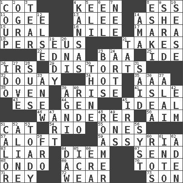 ACROSS 1. Small bed 4. Peachy ____! 8. Curvy letter 11. Double curve, resembling the letter S 13. Toward shelter 14. American tennis player Robert 15. Mountain range 16. Mediterranean tributary 17. Hindu Mythology: god of death 18. Son of Zeus who helped slay Medusa 21. Receives possession of 22. Pulitzer Prize-winning author Ferber 23. Sound made by sheep 25. Binary compound 26. Big collection agency 29. What propaganda does 32. A city in N France, SE of Calais 34. Being at a high temperature 35. Auto club (abbr.) 38. Baking chamber 39. Originate 41. Capri or Wright 43. Compass dir. 44. Commissioned military rank (abbr.) 45. Perfect 46. Roamer 50. Direct toward a target or goal 51. Domesticated feline 54. _ de Janeiro 55. Singles 57. Upward 59. Nineveh was its capital 63. One who doesn't tell the truth 64. South Vietnam president (1954) 67. Transmit 68. Southwest Nigerian state 69. 43,560 square feet 70. Carryall 71. Marina Del _, California 72. Erode 73. Manchild DOWN 1. Overturn; upset 2. Legendary monster 3. Rend 4. Sunflower state 5. Connecticut Ivy Leaguer 6. Snakelike fish 7. Born 8. 1973 Nobel Price Winner (Physics) Leo 9. Tear up 10. Gospel singer Marvin 12. Otherwise 14. Nanny (var.) 19. Whirlpool 20. Single; one (prefix) 21. Make lace 23. Expressions of contempt or scorn 24. Johnson of "Laugh-In" 26. Wedding promise 27. Be footloose 28. Takes to court 30. One or ones belonging to thee 31. Alleged 33. Afresh 36. Toward the sea 37. Jai ____ 39. Hindu god of fire 40. Redecorate 42. Shade tree 45. Angers 47. Nonscientific branch of learning 48. Nomad 49. Followers of ems 51. Bodily heat indicating an inflammation 52. Place in a line 53. Sycophant 56. System (abbr.) 58. From 60. Vintage cars 61. To the inside or interior of 62. Arabian gulf 64. Obsolete 65. Frozen water 66. Period