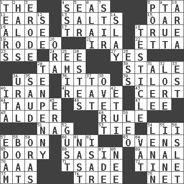 ACROSS 1. Definite Article 4. Oceans 8. Parent Teacher Association (abbr.) 11. Hearing organs 13. Table seasonings 15. Boat paddle 16. _ vera 17. Drop behind 18. Loyal 19. Cowboy competition 21. Retirement account (abbr.) 22. Singer James 23. Compass dir. 24. To sift 27. Consenting reply 29. Scottish caps 30. Lacking originality or spontaneity 34. Purpose 36. "Tell ____ the Marines!" 39. Grain storage towers 40. SW Asia republic 41. Break or tear apart 43. Sure thing 44. Grayish beige 46. Proofreading order 47. Area sheltered from the wind 48. Tree or shrub in the Birch family 49. Governing power 51. Tired old horse 53. Standoff 54. Cards in a Roman deck? 57. Inky black, to poets 60. Corn or form start 63. Baking chambers 65. Dinghy 66. Indian antelope 69. Of or related to the anus 70. Auto club (abbr.) 71. Sadhe (variant) 72. Prong on a fork 73. Mountains (abbr.) 74. Relationship diagram 75. Fish or hair follower DOWN 1. Lacerates 2. Rings 3. Eat (away) 4. Fast jet (abbr.) 5. Ewer handle 6. Jai _ 7. Use a spoon 8. Sweet dark-red dessert wine 9. Strained 10. Length times width 12. Observe 14. Kill 18. One of the two male reproductive glands 20. Mouth or opening 25. Independent ruler or chieftain 26. _____ Park, CO 28. Curvy letter 29. 3-inch nail 31. Toward shelter 32. Old wives' tales, e.g. 33. Eastern Standard Time (abbr.) 34. Mountain range 35. Saudi Arabian king (1953-1964) 37. Make lace 38. Unconcealed 40. Call ___ day 42. Needle holder 45. Epoch 50. Lion 52. Abrupt rush of wind 54. Soviet premier 1918-24 55. Lacking in sense or substance 56. Small island 57. Dutch treat 58. Water vessel 59. Mouths or openings 61. Political cartoonist Thomas 62. Austrian river, tributary to the Danube 64. Large container 67. Binary compound 68. Born