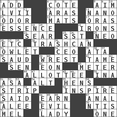 ACROSS 1. Increase 4. ____ d'Azur (French Riviera) 8. Direct toward a target or goal 11. 57 in ancient Rome 13. Caspian sea tributary 14. Billionth: prefix 15. Scent 16. Floor protectors 17. Mouths or openings 18. Gist 21. Removes the wrinkles 22. Scorch 23. Fast jet (abbr.) 25. Modern: prefix 26. And so on (abbr.) 29. File 13 32. A small or young owl 34. Corporate head (abbr.) 35. "One Day ___ Time" 38. Saudi Arabian king (1953-1964) 39. Take or capture by force 41. Docile 43. Elected rep. 44. Age 45. Distance measurement 46. One to whom something is allotted 50. _ tizzy (2 wds.) 51. White ___ sheet 54. Keyboard modifier key 55. Coop moms 57. Remove all contents or possession from 59. Heighten or intensify 63. Expressed in words 64. Merit 67. Of or related to the anus 68. Toward shelter 69. Tending to cause great harm 70. Nuclear Threat Initiatives 71. Cartoonist voice _ Blanc 72. Kenny Rogers chart-topper in '80 73. Single DOWN 1. Medicinal plant 2. Movie discs 3. "Vaya con ____" 4. Device for capturing images 5. Mouth or opening 6. Make lace 7. Curvy letter 8. Composer Copland 9. Silly 10. With motion or animation 12. Angers 14. And not 19. Remaining after all deductions 20. 4-wheeled motor vehicle 21. Call ___ day 23. "______ My Girl" (Turtles hit) 24. Highlander 26. Greek goddess of the dawn 27. It was, poetically 28. A slight indication 30. Aroma 31. Nathan's nickname 33. Pulitzer Prize-winning author Ferber 36. Jacques of French films 37. So be it 39. Not ill 40. Carrot, for example 42. Period 45. Not women's 47. Pet locale 48. Without thickness 49. Car or cant ending 51. Indian state 52. Having lost freshness 53. Satellite of Uranus 56. Connect, as a bridge 58. Binary compound 60. To the inside or interior of 61. Precipitation 62. Otherwise 64. Snakelike fish 65. Actress Gardner 66. To free from