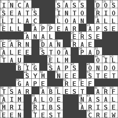 ACROSS 1. South American Indian 5. Backtalk 9. Two (Sp.) 12. Theater features 14. To the inside or interior of 15. _ de Janeiro 16. Pale purple color 17. Grant temporary use of 18. 100% 19. Pipe bend 20. Seem 23. Domed church section 24. Of or related to the anus 25. Celtic language 27. Merit 30. One of the 12 tribes of Israel 32. Actress Charlotte 33. Toward shelter 34. Portico 36. Writing tablet 38. The 19th letter of the Greek alphabet 39. Shade tree 40. Petroleum 43. Of large size 46. Plant excrements 48. Southwest Nigerian state 49. Symbol (abbr.) 51. Born 52. Proofreading order 53. Stare wonderingly 54. Coral ridge 56. Russian ruler of old 58. Most capable 61. Sandy's bark 64. Direct toward a target or goal 65. _ vera 66. Relating to the nose 68. Medical imaging device (abbr.) 69. Teases 70. Get up 71. Car or cant ending 72. Trial 73. Ship's personnel DOWN 1. Capri or Wright 2. Famous astronaut Armstrong 3. Give a ring to 4. _ moment's notice (2 wds.) 5. Filth; sediment 6. Small Philippine buffalo 7. A viewer who gazes fixedly 8. Manchild 9. Window treatment 10. Lubricates 11. Not divided or shared with others 13. Examine minutely or intensely 21. Groovy apts. 22. Food holders 23. At sea 24. A saturated hydrocarbon 26. Hit sharply and swiftly 27. Erode 28. Insect wing 29. Reuben's nickname 31. Pitcher Ryan 35. Electrical Unit 37. Do not 41. Binary compound 42. Car dealer's back yard 44. Austrian river, tributary to the Danube 45. Flimflam 47. Observes 48. Order of Saint Francis (abbr.) 50. Ear of corn 53. Street urchin 55. Inactive volcano in Sicily 56. Docile 57. Title for a man of rank and authority 59. Moves up and down 60. For fear that 61. SW Saudi Arabia district 62. Raze (variant) 63. Soared 65. Nonscientific branch of learning 67. Curve