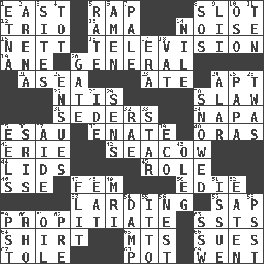 ACROSS 1. Compass direction 5. Hit sharply and swiftly 8. Narrow opening 12. Musical group of three 13. Nanny (var.) 14. Annoying sound 15. Remaining after all deductions 16. Boob tube 19. One (Scot) 20. Commissioned military rank 21. At sea 23. Had dinner 24. Fitting 27. Nuclear Threat Initiatives 30. Cole _ (cabbage dish) 31. Spring feasts 34. California wine valley 35. He sold his birthright 38. Related on the mother's side 40. Mouths or openings 41. 4th largest of the Great Lakes 42. Manatee 44. Flaplike coverings 45. Hero or heavy, e.g. 46. Compass dir. 47. Opposite of masc. 50. Singer Brickell 53. Preparing or cooking with lard 57. Plant excrement 59. Appease 63. Fast planes 64. Chest covering 65. Mountains (abbr.) 66. Takes to court 67. Lacquered or enameled metalware 68. Plant holder 69. Left DOWN 1. Inactive volcano in Sicily 2. Sports stadium 3. Settings 4. Small child 5. Pace 6. So be it 7. Diluted with white 8. Mayday 9. Cards in a Roman deck? 10. Bear (Spanish) 11. "___ Little Indians" 14. The longest river in the world 17. Epoch 18. Large container 20. Yard entry 22. Follows as a consequence or result 24. Having or resembling wings 25. Dad 26. It was, poetically 28. Binary compound 29. Elected reps. 30. Overwhelmed 32. Actress Charlotte 33. Play the lead 35. Snakelike fish 36. Indian titles of respect 37. Helper 39. Environmental prefix 43. Cassini of fashion 47. Secret move to avoid paying debts 48. Consume 49. Medical imaging device (abbr.) 51. Come out of 52. Ingested 54. Moist 55. "Tell ____ the Marines!" 56. A home for chicks 58. Inconspicuous attention getter 59. Pacific Standard Time (abbr.) 60. 17th letter of the Greek alphabet 61. Lubricate 62. Before (prefix) 63. Compass dir.
