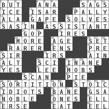 ACROSS 1. With the exception that 4. Santa ___, CA 7. Settles 11. Frozen water 12. Austrian river, tributary to the Danube 13. Chummy 14. Insect wing 15. Open wide 16. Finds the solution 17. Indian antelope 19. Helper 21. Grand Old Party 23. Angers 24. Greater amount 25. Personal question 26. Arrange properly for use 29. More uncommon 30. Followers of ems 31. Before (prefix) 32. Title for a knight 33. Big collection agency 34. The 18th letter of the Arabic alphabet 35. The first octave above the treble staff 36. _-fi 37. Lacking in sense or substance 40. Consenting reply 41. Area sheltered from the wind 42. Crowds into 43. Examine minutely or intensely 45. Sliced dessert 46. Decision 51. Unemotional 55. Foolish or stupid persons 56. Object of repulsion 58. Girls' org. (abbr.) 59. Having high moral qualities 60. Washington bills 61. Pipe bend 62. Celtic language 63. Erode 64. Snakelike fish DOWN 1. Prejudice 2. Southern CA. univ. 3. Afternoon social gatherings 4. White ___ sheet 5. California wine valley 6. Ancient Greek god of war 7. Table seasonings 8. Inventor's middle name 9. Small, secluded valley 10. System (abbr.) 12. Refuse to acknowledge 13. Airs 16. Fathers 18. Composer Stravinsky 20. Public displays of written messages 22. For each 24. Shops 25. Nest on high 26. Connects, as a bridge 27. One of the Great Lakes 28. "___ Little Indians" 29. Cause heat under the collar 32. Declare 33. Ancient Celtic tribe of eastern Britain 36. Narrow boards 37. Naughty child 38. Annoying sounds 39. Collude with 43. Took without asking 44. Quote 46. Trig term 47. Scent 48. Teases 49. Mitch Miller's instrument 50. Grandmother 52. Double curve, resembling the letter S 53. Small island 54. Give a ring to 57. Fish or hair follower