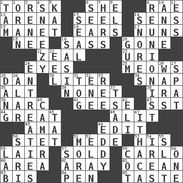 ACROSS 1. Cod relative 6. A female animal or person 9. Actress Charlotte 12. Sports stadium 13. Stitch closed the eyes of (a falcon) 14. Elected reps. 15. French painter Edouard 16. Hearing organs 17. Religious women 18. Born 19. Backtalk 20. Went 21. Ardor 23. RI univ. 24. Snake ____ (dice throw) 25. Catcalls? 28. Daniel's nick name 30. 61 cubic inches 34. Fastener 35. Keyboard modifier key 36. Music written for nine 38. Lyricist Gershwin 39. Drug cop 41. Honkers 43. Fast jet (abbr.) 44. Relatively large 46. Set down 48. Housemaid (var.) 49. Prepare for publication 50. Proofreading order 51. Ancient Persian 53. Part of HMS, perhaps 56. Den 57. Exchanged or delivered for money 58. Monte _, Las Vegas Hotel/Casino 60. Type of rug 61. Like ___ of sunshine 62. Sea 63. Twice 64. Writing instrument 65. Clothes sense DOWN 1. Scottish cap 2. NW Algerian seaport 3. French philosopher Descartes 4. Dwarf with a sinus problem 5. Krazy ___ of comics 6. Oceans 7. Possessive pronoun 8. Raised railways 9. One who advocates reunion 10. Queen of England 1702-14 11. Curvy letter 13. Lick closed 14. Sounds asleep 19. Indian antelope 20. Chewing product 22. Snakelike fish 24. Pleas 26. Armed conflicts 27. Argument over a trivial matter 28. Mild oath, euphamism for damn 29. Having or resembling wings 31. Coat; cloak 32. Compass dir. 33. To riddle 37. Sadhe (variant) 40. Device for capturing images 42. Biblical high priest 45. Make lace 47. New York city 49. Whirlpool 50. Indian skirt 51. Greater amount 52. Liveliness 54. Angers 55. Narrow board 56. Experiment locale 57. Plant excrement 58. Small bed 59. Single