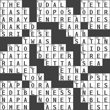 ACROSS 1. Definite Article 4. Hereditary estate 8. False hair 12. Relaxation 14. Literary convention 16. River in Europe 17. Like ___ of sunshine 18. Pleas 20. Moved through 22. Ewer handle 23. Compass dir. 24. Indian title of respect (Mr.) 25. Compass dir. 28. Experiment locale 30. It was, poetically 31. Smooth fabric 35. River (Sp.) 37. A whole individual unit 40. Flaplike coverings 41. Jacques of French films 42. Postpone 44. Not kosher 45. Monetary unit of Yemen 46. Singer James 47. Ocean 48. An arm off of a larger body of water 50. Inactive volcano in Sicily 52. Pull behind 54. To sift 55. Air pressure measure (abbr.) 58. Hit sharply and swiftly 61. Mouth or opening 63. Lies 65. The property of being fit to eat 70. 1994 drama film starring Jodie Foster 71. California wine valley 72. Music written for nine 73. Competent 74. Sign of things to come 75. Toward the sea 76. Eastern Standard Time (abbr.) DOWN 1. Pulls apart 2. Ethiopian city, capital of Harari 3. 1973 Nobel Price Winner (Physics) Leo 4. Shoshoni 5. Spanish title 6. Fitting 7. Old wives' tales, e.g. 8. Small child 9. Singer Brickell 10. Adolescent 11. Celtic language 13. Sight organ 15. Lick closed 19. Ancient river in northeast Turkey 21. Morning condensation 26. Expressed in words 27. First name in cosmetics 29. Greek mezzo-soprano Agnes 30. Bathroom plumbing fixture 32. Become fatigued 33. It may be bright or harebrained 34. Science/research agcy. 35. Precipitation 36. Slanted text style (abbr.) 38. Bank Draft (abbr.) 39. Distance measurement 41. Three (prefix) 43. Pace 49. Instrument 51. Fish or hair follower 53. Songbird 55. Cadet 56. Exchanges for money 57. Small island 58. Former U.S. Attorney General Janet 59. First of billions? 60. Corncob 62. Small Philippine buffalo 64. Santa ___, CA 66. Bar 67. Followers of ems 68. Observe 69. R.R. building
