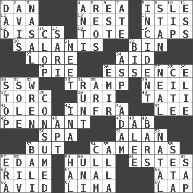 ACROSS 1. One of the 12 tribes of Israel 4. Length times width 8. Small island 12. Actress Gardner 13. Egg locale 14. Nuclear Threat Initiatives 15. Plates 18. Carry 19. Balmoral and tarboosh 20. Deli grouping 22. Storage container 23. Old wives' tales, e.g. 24. Help 25. Sliced dessert 26. Center 30. Compass dir. 33. _____ steamer (cargo ship) 36. Famous astronaut Armstrong 37. Torque (variant) 39. RI univ. 40. Jacques of French films 41. Butter sub 42. Kind of red light 44. Area sheltered from the wind 45. Pre-World Series prize 47. Pat or tap gently 50. Health resort 51. Actor Alda or Thicke 53. With the exception that 54. Devices for capturing images 57. Dutch treat 59. Frame or body of a ship 61. _____ Park, CO 63. Cause heat under the collar 64. Of or related to the anus 65. _ moment's notice (2 wds.) 66. Enthusiastic 67. Pale green bean 68. Pet locale DOWN 1. Male parent 2. Advice 3. Relating to the nose 4. Opposed to 5. Vintage cars 6. Eastern Standard Time (abbr.) 7. Had dinner 8. Happening 9. Comedian Laurel of Laurel & Hardy 10. Mouth edge 11. Curvy letter 16. Hoof sound 17. Indian skirt 21. Rendezvous 22. Altar cloth linen 24. Viper 26. Independent ruler or chieftain 27. Anneal 28. Quote 29. Writer Wiesel 30. Obstruct or block passage 31. Flatfish 32. Songbird 34. The smallest animal of a litter 35. Sandy's bark 38. Ingested 42. _ tizzy (2 wds.) 43. First man 46. Fitting 48. Toward shelter 49. Soap units 52. Relating to or accompanying birth 53. Indonesian resort city 54. Burrowing marine mollusk 55. Silent film actress Nazimova 56. Bristle 57. Epoch 58. HTML Container Element 59. Actor Linden 60. Single; one (prefix) 62. Plant excrement