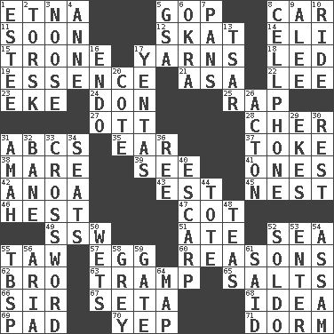 ACROSS 1. Inactive volcano in Sicily 5. Republican Party 8. 4-wheeled motor vehicle 11. Within a short period 12. Three-handed card game 14. Biblical high priest 15. Heavy duty weighing machine 17. Tall tales 18. Directed 19. Gist 21. White ___ sheet 22. Area sheltered from the wind 23. Supplement with great effort 24. Spanish title 25. Reproach for some lapse or misdeed 27. Baseball player Mel 28. "Mermaids" star 31. Lettered men learn these first 35. Ewer handle 37. Puff or smoke 38. Female horse 39. Observe 41. Washington bills 42. Small Philippine buffalo 43. Eastern Standard Time (abbr.) 45. Egg locale 46. Behest 47. Small bed 49. Compass dir. 51. Had dinner 52. Ocean 55. The 23rd letter of the Hebrew alphabet 57. Oval reproductive body of a fowl 60. Thinks logically 62. Sis' sibling 63. _____ steamer (cargo ship) 65. Table seasonings 66. Title for a knight 67. Bristle 68. The main thing one is thinking about 69. Groovy apt. 70. Slangy assent 71. Dormintory (informal) DOWN 1. First name in cosmetics 2. Cod relative 3. Trap for birds or small mammals 4. Queen of England 1702-14 5. Girls' org. (abbr.) 6. Gumbo ingredient 7. Baking dishes 8. Portable communications device 9. Toward shelter 10. Travel on an animal 13. Russian ruler of old 16. Inside; within (prefix) 17. Gossips 20. ____ d'Azur (French Riviera) 26. NE Massachussets city 29. Supplements with great effort 30. Take ten 31. Nursemaid 32. Object of repulsion 33. What you're doing now 34. Theater features 36. To separate or throw off 40. Fortification 44. Carry 48. Beverages made from leaves 50. Moistens 52. Twentieth part of a lira 53. Keyboard key 54. Indian state 55. Cook's measure (abbr.) 56. Operatic vocal solo 58. Jennifer or Joel 59. Yard entry 61. Stated 64. Atlas unit