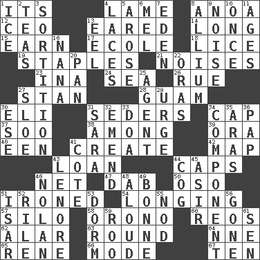 ACROSS 1. It is 4. Unable to walk 8. Small Philippine buffalo 12. Corporate head (abbr.) 13. Having ears or earlike features 14. Yearn 15. Merit 17. Learning spot: Fr. 18. Louse (plural) 19. Paper fasteners 21. Annoying sounds 23. _ tizzy (2 wds.) 24. Ocean 26. Regret 27. Comedian Laurel of Laurel & Hardy 28. Island territory of the United States 30. Biblical high priest 31. Spring feasts 34. Head covering 37. "Barney Miller" actor Jack 38. Amid 39. Mouth or opening 40. Car or cant ending 41. Make 42. Atlas unit 43. Grant temporary use of 44. Smile enhancers 46. Fish or hair follower 47. Pat or tap gently 50. Bear (Spanish) 51. Pressed 54. Yearning 57. Grain storage tower 58. U. of Maine site 60. Vintage cars 62. Having or resembling wings 63. One shot 64. Compass dir. 65. French philosopher Descartes 66. Method 67. Nine, plus one DOWN 1. Frozen water 2. Afternoon social gatherings 3. Making a chance decision by using lots 4. Shoestrings 5. Came up 6. Cartoonist voice _ Blanc 7. Locale of original sin 8. Plant genus of onion and garlic 9. Annoying sound 10. At one time in the past 11. Grows older 13. Snakelike fish 16. Grandmother 20. Baking dish 22. Mouths or openings 25. Rep 27. A type of plum 29. Goad 30. Compass dir. 31. "Two Mules for Sister ____" 32. Make improvements or corrections to 33. ___ good deed 34. Part 35. Ancient river in northeast Turkey 36. Infant food 41. ____ d'Azur (French Riviera) 43. Poe poem 44. Gear tooth 45. SW Saudi Arabia district 46. Pitcher Ryan 48. Verbally 49. Child's nurse 51. Austrian river, tributary to the Danube 52. Cause heat under the collar 53. Dormintory (informal) 55. Dreamland 56. Went 59. Friend of Pooh 61. Elected rep.
