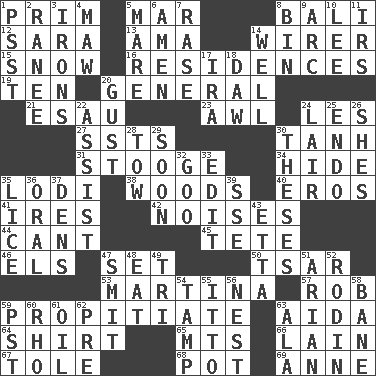 ACROSS 1. Demure 5. Spoil 8. Indonesian resort city 12. "Two Mules for Sister ____" 13. Nursemaid (var.) 14. One who wires 15. Overwhelm 16. Homes 19. "___ Little Indians" 20. Commissioned military rank 21. Son of Isaac 23. Leather borer 24. French article 27. Fast planes 30. Hyperbolic tangent 31. Moe Howard, for one 34. Flintstone garb 35. Farming town in central California 38. Forest 40. Greek god of love 41. Angers 42. Annoying sounds 44. Patter 45. Wig 46. Raised railways 47. Put into a specified state 50. Russian ruler of old 53. Chrissie's court nemesis 57. Director Reiner 59. Appease 63. Opera by Verdi 64. Chest covering 65. Mountains (abbr.) 66. (Had) reclined 67. Lacquered or enameled metalware 68. Plant holder 69. Queen of England 1702-14 DOWN 1. Inconspicuous attention getter 2. The wife of a rajah (variant) 3. Removes the wrinkles 4. Informal term for the mouth 5. Female horse 6. So be it 7. To erase 8. Storage container 9. Curve 10. Area sheltered from the wind 11. Big collection agency 14. Not ill 17. Retirement account (abbr.) 18. Simpleton 20. Abrupt rush of wind 22. Aid 24. Den 25. Inside; within (prefix) 26. "______ My Girl" (Turtles hit) 28. Pull behind 29. Within a short period 30. College papers 32. Thick or sticky substance 33. Prepare for publication 35. Louse (plural) 36. Of the mouth 37. Lairs 39. Compass dir. 43. Singer James 47. Stricken, poetically 48. Consume 49. Three (prefix) 51. Believer in; advocate of (suffix) 52. "The Thinker" sculptor 54. Pack (down) 55. "Tell ____ the Marines!" 56. A home for chicks 58. Object of repulsion 59. Pacific Standard Time (abbr.) 60. 17th letter of the Greek alphabet 61. Petroleum 62. Before (prefix) 63. In the manner of