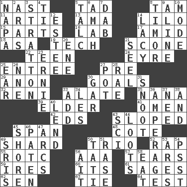 ACROSS 1. Political cartoonist Thomas 5. Bit 8. Scottish cap 11. Nick name for Arthur 13. Nanny (var.) 14. _ and Stitch 15. Actors' quests 16. Experiment locale 17. Among 18. White ___ sheet 19. Technology 21. Biscuitlike quick bread 22. Adolescent 24. Jane of fiction 25. Main course 27. Before (prefix) 29. At once, immediately (arch.) 30. Purposes of endeavors 32. Painter Guido (1575-1642) 33. Having winglike extensions 35. Grandmother 39. A person who is older than you are 41. Sign of something about to happen 42. Begley and Asner 43. Had an oblique or slanted direction 45. Connect, as a bridge 48. ____ d'Azur (French Riviera) 49. Broken piece 50. Musical group of three 52. Strike 55. College mil. group 56. American Automobile Association (abbr.) 57. Pulls apart 59. Angers 60. ___ a Wonderful Life 61. Gurus 62. Elected rep. 63. Neckwear 64. Trial DOWN 1. California wine valley 2. Caspian sea tributary 3. Ski resort town in Vermont 4. Teat (slang) 5. Baby powder 6. Nursemaid 7. Pat or tap gently 8. Southeast Indonesia island 9. Place in a line 10. Method 12. First name in cosmetics 14. Made of lace 20. Compass dir. 21. Sew up the eyelids of hawks and falcons 23. Bert's buddy 25. Ewer handle 26. Compass dir. 27. Plant holder 28. Actress Charlotte 30. Slender fish 31. Snout, nose 33. Find the sum of 34. French article 36. Electrical Measurement 37. Born 38. Also 40. Grant temporary use of 43. _-fi 44. Plunders 45. Dinah or Pauly 46. Eucharist need 47. Curves 49. Indian titles of respect 50. Jacques of French films 51. Raze (variant) 53. Ancient Greek god of war 54. Inconspicuous attention getter 56. Small island 58. Erode
