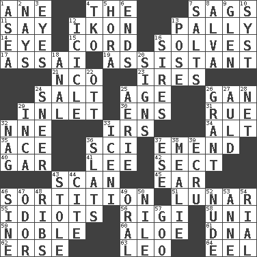 ACROSS 1. One (Scot) 4. Definite Article 7. Droops 11. Declare 12. Visual representation of an object 13. Chummy 14. Sight organ 15. Drawstring 16. Finds the solution 17. Slender Brazilian palm 19. Helper 21. Non-commissioned officer (abbr.) 23. Angers 24. Table seasoning 25. Grow older 26. Separate the seeds from cotton 29. An arm off of a larger body of water 30. Followers of ems 31. Regret 32. Compass dir. 33. Big collection agency 34. The first octave above the treble staff 35. Adept person 36. _-fi 37. Make improvements or corrections to 40. Slender fish 41. Area sheltered from the wind 42. Religious group 43. Examine minutely or intensely 45. Ewer handle 46. Making a chance decision by using lots 51. Type of eclipse 55. Foolish or stupid persons 56. Swiss mountan, "Queen of the Mountains" 58. Corn or form start 59. Having high moral qualities 60. _ vera 61. Heredity factor (abbr.) 62. Celtic language 63. Lion 64. Snakelike fish DOWN 1. Toward the sea 2. Negative votes 3. Snake ____ (dice throw) 4. Ring climax 5. Israeli folk dance 6. Conclusions 7. Table seasonings 8. Inventor's middle name 9. Small, secluded valley 10. System (abbr.) 12. Ice on the eave 13. Airs 16. Fathers 18. Of or related to the anus 20. Public displays of written messages 22. Baseball player Mel 24. Contemptuous expression 25. Nest on high 26. Monetary aid 27. Old (Scot.) 28. Fish or hair follower 29. South American Indian 32. Tired old horse 33. Ancient Celtic tribe of eastern Britain 36. Narrow boards 37. Compass dir. 38. Ear of corn 39. Shade of tan 43. Took without asking 44. Quote 46. Trig term 47. Scent 48. Chest bones 49. Spoken 50. "Death on the ____" 52. Unadorned 53. Queen of England 1702-14 54. Monetary unit of Yemen 57. Thick or sticky substance