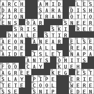 ACROSS 1. Bowlike part 5. Among 9. French article 12. Have the gumption 13. "Two Mules for Sister ____" 14. Food container 15. The Jewish people; Israel 16. SW Asia republic 17. Von Bismarck 18. Followers of ems 19. Boat paddle 21. Scornful expression 22. Indian titles of respect 24. What Jean-Claude Killy likes to do 26. To separate or throw off 27. A sleeping potion; an opiate (poet.) 28. Disorderly outburst 29. A really long time 30. Approach 32. Otherwise 36. 43,560 square feet 37. 100% 38. Located in or toward the back 39. Assistant 40. Small island 42. California wine valley 43. Pismires 44. Leaves out 46. Egg _ yung 49. Island 50. Malaysian steamed pastry 51. Match 53. Cask 54. Eastern Standard Time (abbr.) 57. Kill 58. Corncob 61. 4th largest of the Great Lakes 62. False hair 63. Calm and collected 64. Past tense of be (plural) 65. Compass dir. 66. Clip 67. Paradise DOWN 1. Edge tool used to cut and shape wood 2. Precipitation 3. What you're doing now 4. Layer 5. SW Saudi Arabia district 6. Third mo. 7. Retirement account (abbr.) 8. Daniel's nick name 9. 61 cubic inches 10. First name in cosmetics 11. Dinah or Pauly 14. Spanish title 19. Lubricate 20. Toward the sea 21. Title for a knight 23. Indian princess (variant) 24. Showing deterioration from age 25. Apertif with cassis 27. Tenth: prefix 28. Exchanges for money 29. Auto club (abbr.) 31. Characterized by obscenity 32. Bert's buddy 33. Resembling or made to resemble leather 34. Plant excrements 35. Epoch 40. _ tizzy (2 wds.) 41. Casino tip 43. Adept person 45. Large cup 46. Goes without food and/or water 47. Stares 48. Declaim 52. Sight organ 53. Seaweed 55. Father 56. Adolescent 58. Personal Computers (abbr.) 59. Electrically charged atom 60. Luau course 61. She-sheep