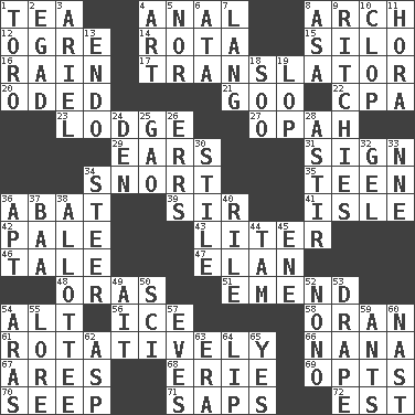 ACROSS 1. Afternoon social gathering 4. Of or related to the anus 8. Bowlike part 12. Legendary monster 14. Round or rotation of duties 15. Grain storage tower 16. Precipitation 17. Interpreter 20. Wrote a lyric poem 21. Thick or sticky substance 22. Tax preparer (abbr.) 23. Cabin 27. Brightly colored fish 29. Hearing organs 31. Signal 34. Derisive sound 35. Adolescent 36. Blind as ____ 39. Title for a knight 41. Capri or Wright 42. Light colored 43. 61 cubic inches 46. Falsehood 47. Style 48. Mouths or openings 51. Make improvements or corrections to 54. Keyboard modifier key 56. Frozen water 58. Northwest Algerian city 61. Producing rotation 66. Grandmother 67. Ancient Greek god of war 68. One of the Great Lakes 69. Chooses 70. Ooze 71. Plant excrements 72. Eastern Standard Time (abbr.) DOWN 1. "Corrida" creature 2. Mild oath 3. Satellite of Uranus 4. Tate display 5. Or not 6. _ moment's notice (2 wds.) 7. Austrian-born American filmmaker Fritz 8. White ___ sheet 9. Actors Guy, Robert Welles, and Clint 10. Hoof sound 11. Israeli folk dance 13. Inside; within (prefix) 18. "Barney Miller" actor Jack 19. Chop off 24. Lair 25. E Mali city 26. Blunders 28. Being in motion 30. Vertical member of a panel or frame 32. Set 33. Compass dir. 34. Guide 36. Fitting 37. Sound made by sheep 38. One to whom something is allotted 40. Cause heat under the collar 44. Scottish cap 45. Compass dir. 49. Small island 50. _-fi 52. Words to Nanette 53. Window treatment 54. Caspian sea tributary 55. Old wives' tales, e.g. 57. Nights before holidays 59. Pismires 60. Political cartoonist Thomas 62. Cleo's killer 63. Period 64. Mouth edge 65. Affirmative reply