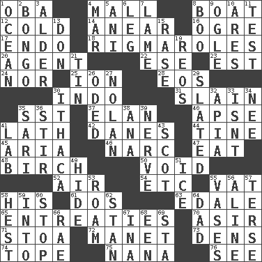 ACROSS 1. Chief or king in Benin or Nigeria 4. Promenade 8. Water vessel 12. Having a low temperature 14. Approach 16. Legendary monster 17. Inside; within (prefix) 18. Complicated, petty procedures 20. Rep 22. Compass dir. 23. Eastern Standard Time (abbr.) 24. Not either 25. Electrically charged atom 28. Greek goddess of the dawn 30. _ china 31. Killed 35. Fast jet (abbr.) 37. Style 40. Domed church section 41. Thin strip of wood or metal 42. Natives or inhabitants of Denmark 44. Prong on a fork 45. Operatic vocal solo 46. Drug cop 47. Consume 48. A tree used for making furniture 50. Nothingness 52. Wind 54. And so on (abbr.) 55. Large container 58. Part of HMS, perhaps 61. Two (Sp.) 63. Peak District village in England 65. Pleas 70. SW Saudi Arabia district 71. Portico 72. French painter Edouard 73. Hiding places for outlaws 74. Drink excessively 75. Grandmother 76. Observe DOWN 1. Sea 2. Beat drum 3. Tree or shrub in the Birch family 4. Make imperfect 5. Cuckoo 6. Part of a journey 7. Unable to walk 8. Oct. 31 cry 9. Stare 10. Ancient Greek god of war 11. Trial 13. Spanish title 15. To erase 19. Vintage cars 21. Metal container 26. Wrote a lyric poem 27. Pitcher Ryan 29. Scheduled 30. New York city 32. Capital of Western Samoa 33. Is not 34. Born 35. Indian skirt 36. Agitate 38. Santa ___, CA 39. Boldness 41. Experiment locale 43. Native of Scotland 49. Flintstone garb 51. Frozen water 53. Wander aimlessly 55. Flower holders 56. Place in a line 57. Laconic 58. Command 59. To the inside or interior of 60. Halt 62. Comedian Laurel of Laurel & Hardy 64. Male parent 66. Actress Charlotte 67. _ tizzy (2 wds.) 68. Car or cant ending 69. R.R. building