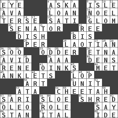 ACROSS 1. Sight organ 4. "____ silly question..." 8. Small island 12. Actress Gardner 13. Grant temporary use of 14. Christmas carol 15. Laconic 18. Suttee (variant) 19. Take by theft 20. Elected representative 22. To sift 23. Food container 24. Altar cloth linen 25. For each 26. Of or relating to Laos or its people 30. "Barney Miller" actor Jack 33. More peculiar 36. Inactive volcano in Sicily 37. Enthusiastic 39. American Automobile Association (abbr.) 40. Cub Scout units 41. French philosopher Descartes 42. Pig sounds 44. Was introduced to 45. Short socks 47. Trim (branches) 50. Nonscientific branch of learning 51. A single undivided whole 53. _ moment's notice (2 wds.) 54. Leopard's kin 57. Indian skirt 59. A type of plum 61. Fragment 63. Butter sub 64. Hero or heavy, e.g. 65. Declare 66. Comedian Laurel of Laurel & Hardy 67. Slanted text style (abbr.) 68. Binary compound DOWN 1. Ingest 2. Jacques Cousteau's middle name 3. Having ears or earlike features 4. In addition 5. Fly high 6. Krazy ___ of comics 7. Black tropical American cuckoo 8. Swallowed 9. Flatfish 10. Lion 11. Shade tree 16. Clip 17. Relaxation 21. Through, poetically 22. River (Sp.) 24. Drinking establishment 26. Path through which fluid escapes 27. A distinct part 28. Queen of England 1702-14 29. Political cartoonist Thomas 30. "Two Mules for Sister ____" 31. Baking chamber 32. Pig sound 34. Raised platform 35. One of the 12 tribes of Israel 38. Conveyance 42. Baseball player Mel 43. Turn sharply 46. Period 48. Singles 49. Heart or essence 52. Tarsus (plural) 53. Length times width 54. Root beer relative 55. The bottom of a shoe or boot 56. Froth on beer 57. Distress signal 58. The first octave above the treble staff 59. Indian title of respect (Mr.) 60. Car dealer's back yard 62. Color