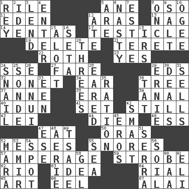 ACROSS 1. Cause heat under the collar 5. A saturated hydrocarbon 8. Bear (Spanish) 11. Locale of original sin 12. Ancient river in northeast Turkey 13. Tired old horse 14. Gossips 17. One of the two male reproductive glands 19. Keyboard key 21. Cigar-shaped 22. Writer of Portnoy's Complaint (1969) 23. Affirmative reply 24. Compass dir. 27. Conductor's collection 29. Begley and Asner 32. Music written for nine 34. Hearing organ 36. Family _ (genealogy) 37. Queen of England 1702-14 38. Epoch 39. Of or related to the anus 40. Goddess of spring and wife of Bragi 41. Arrange properly for use 42. Not moving 43. Luau accessory 44. South Vietnam president (1954) 46. Double-curved letter 47. Erode 50. Mouths or openings 52. Makes clutter 55. Sounds asleep 57. Electrical Measurement 59. Disco prop 62. _ de Janeiro 63. The main thing one is thinking about 64. Monetary unit of Yemen 65. Nonscientific branch of learning 66. Snakelike fish 67. Jai ____ DOWN 1. Marina Del _, California 2. Binary compound 3. Grant temporary use of 4. Keyboard key 5. "We ___ not amused" (Victoria) 6. Characterized by obscenity 7. First name in cosmetics 8. Single time 9. Table seasoning 10. Double curve, resembling the letter S 12. Had dinner 15. Upward 16. Stalk of a moss capsule 18. Big collection agency 20. Triplets 24. Slow-paced one 25. Message 26. World-weariness 28. Having ears or earlike features 29. Bert's buddy 30. Allots cards 31. Makes a sale 33. Car or cant ending 35. Food allowance for one day 36. Make lace 42. Don Adams' spy role 45. Greek god of love 47. Compass dir. 48. Nest on high 49. Sadhe (variant) 51. Father Junipero _ 52. Hindu Mythology: god of death 53. Independent ruler or chieftain 54. Specific locale 55. Ocean 56. The visible part of the earth's surface 58. Set 60. Sound made by sheep 61. Biblical high priest