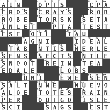 ACROSS 1. The 18th letter of the Arabic alphabet 4. Chooses 8. Tax preparer (abbr.) 11. Greek god of love 13. Trading vessels 15. Director Reiner 16. Loose flowing garment 17. Cod relative 18. Bristle 19. An arm off of a larger body of water 21. Parent Teacher Assoc. 22. Trial 23. Compass dir. 24. Lubricate 27. The 19th letter of the Greek alphabet 29. Hindu god of fire 30. Standard of perfection 34. Keyboard key 36. Nuclear Threat Initiatives 39. Haggard of country music 40. Elected reps. 41. Religious groups 43. The longest river in the world 44. Snob 46. It's straight from the horse's mouth 47. Beverage made from leaves 48. Peak District village in England 49. Tennis shots 51. University (slang) 53. She-sheep 54. Elected rep. 57. Table seasoning 60. Compass dir. 63. New (sp.) 65. _ vera 66. Lugs 69. Water falling in drops from the sky 70. For each 71. Money paid out 72. Capri or Wright 73. _-fi 74. Droops 75. Eastern Standard Time (abbr.) DOWN 1. Nest on high 2. Metal shackles 3. Impressive in appearance 4. Sep. follower 5. Adept person 6. Canvas cover 7. System (abbr.) 8. Algonquian 9. Plant holders 10. Blind as ____ 12. Observe 14. Three-handed card game 18. SAT takers 20. Coat; cloak 25. Restaurants 26. 61 cubic inches 28. Direct toward a target or goal 29. Utter; complete 31. 4th largest of the Great Lakes 32. Silent film actress Nazimova 33. Area sheltered from the wind 34. Be inclined (to) 35. Small Philippine buffalo 37. Frozen water 38. Vertical member of a panel or frame 40. Compass dir. 42. Frozen precipitation 45. Nine, plus one 50. Benjamin's nick name 52. To the inside or interior of 54. Gospel singer Marvin 55. Vices 56. Music written for nine 57. Plant excrements 58. Actor Baldwin 59. Australian parrot (variant) 61. Good sense 62. Singer James 64. RI univ. 67. Ovum 68. Mayday