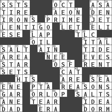 ACROSS 1. Fast planes 5. Sep. follower 8. White ___ sheet 11. Hoop that covers a wheel 12. Period of immesurable duration 14. Lair 15. Removes the wrinkles 17. First class 18. _ stream 19. Small, flat, pigmented spot on the skin 21. Allow 22. Connecticut Ivy Leaguer 23. Compass dir. 24. Infant locale 25. Affectionate concern, for short 27. Petroleum 28. Slanted text style (abbr.) 31. Table seasoning 35. The 18th letter of the Arabic alphabet 37. Event that recurs at intervals 38. Length times width 39. Born 41. Nights before holidays 42. Play the lead 43. Order of Saint Francis (abbr.) 45. Monthly bill 46. Puts into a specified state 47. Domesticated feline 49. Part of HMS, perhaps 51. "We ___ not amused" (Victoria) 52. Ocean 55. Compass dir. 57. Parent Teacher Assoc. 60. Thinks logically 62. Slender fish 63. Lowest deck of a ship 65. Table seasonings 66. A saturated hydrocarbon 67. Rend 68. The main thing one is thinking about 69. June honoree 70. Period 71. Dormintory (informal) DOWN 1. Vertical member of a panel or frame 2. Founders of families 3. Marketplace scale 4. Posted 5. Rowing implement 6. To provide with a ceiling 7. Heavy book 8. Descriptive word 9. Sew up the eyelids of hawks and falcons 10. Opposed to 13. Remaining after all deductions 16. Grain storage tower 17. Cotton for raincoats, e.g. 20. Greek goddess of the earth (variant) 26. 61 cubic inches 29. Arabian gulf 30. For fear that 31. Backtalk 32. Johnson of "Laugh-In" 33. Tough but pliablecoriaceous 34. Tarsus (plural) 36. Modern: prefix 40. Fortification 44. Conductor's collection 48. Beverages made from leaves 50. Blemish 52. Twentieth part of a lira 53. Keyboard key 54. Indian state 55. Mild oath 56. Nanny 58. Family _ (genealogy) 59. Having or resembling wings 61. Stated 64. Mouth or opening