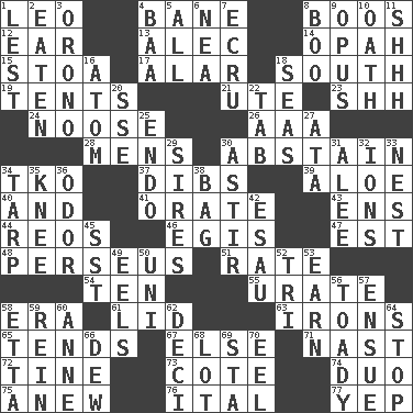 ACROSS 1. Lion 4. Object of repulsion 8. Scornful sounds 12. Ewer handle 13. Actor Baldwin 14. Brightly colored fish 15. Portico 17. Having or resembling wings 18. Compass direction 19. Portable shelters 21. Shoshoni 23. Quiet! 24. Trap for birds or small mammals 26. Auto club (abbr.) 28. Not women's 30. Choose not to consume 34. Ring climax 37. Claim 39. Medicinal plant 40. Added to 41. Speak pompously 43. Followers of ems 44. Vintage cars 46. Armor plate that protects the chest 47. Eastern Standard Time (abbr.) 48. Son of Zeus who helped slay Medusa 51. Pace 54. Nine, plus one 55. A salt of uric acid 58. Period 61. Hat (slang) 63. Metal shackles 65. Looks after 67. Otherwise 71. Political cartoonist Thomas 72. Prong on a fork 73. ____ d'Azur (French Riviera) 74. Superhero pair 75. Afresh 76. Slanted text style (abbr.) 77. Slangy assent DOWN 1. For fear that 2. Ingested 3. U. of Maine site 4. Sound made by sheep 5. 100% 6. Teachers' org. 7. Shade of tan 8. Oct. 31 cry 9. Musical composition 10. Pledge 11. Quiet! 16. Smallest unit of an element 18. Oceans 20. Compass dir. 22. Bar bill 25. Inside; within (prefix) 27. _ moment's notice (2 wds.) 29. Founders of families 30. Moving or stirring 31. Toward shelter 32. Charged particles 33. Egg locale 34. Canvas cover 35. Leg joint 36. Aroma 38. Container for groceries 42. He sold his birthright 45. Fast jet (abbr.) 49. Snakelike fish 50. Corn or form start 52. Three (prefix) 53. Merit 56. Sycophant 57. Follow as a consequence or result 58. Singer James 59. It's straight from the horse's mouth 60. Singer Murray 62. Tenth: prefix 64. Constrict 66. Morning condensation 68. Car dealer's back yard 69. R.R. building 70. Snakelike fish