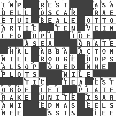 ACROSS 1. Naughty child 4. Relief 8. White ___ sheet 11. Small valley 13. Witty Wilde 15. Actress Charlotte 16. Needle case 17. Calif. Air Force Base 18. "Beetle Bailey" pooch 19. Nick name for Arthur 21. "___ Little Indians" 22. Distinctive style or manner 23. Lion 24. Elect 27. Binary compound 29. At sea 30. Declaim 34. Actor Linden 36. Swedish rock group 39. NE Massachussets city 40. Place where flour is made 41. Makeup applied to the cheeks 43. I made a mistake 44. Columnist Joseph or Stewart 46. Wrote a lyric poem 47. Madame (abbr.) 48. Graphs 49. The longest river in the world 51. Nervous spasm 53. Afternoon social gathering 54. Eastern Standard Time (abbr.) 57. Mitch Miller's instrument 60. Allow 63. Food holder 65. Immoral or dissolute person 66. Join together 69. Austrian river, tributary to the Danube 70. Cuckoo 71. Ferber et al. 72. Snakelike fish 73. Born 74. Fast planes 75. Area sheltered from the wind DOWN 1. Perfect 2. Distance measurement (Brit.) 3. Mickey's pet 4. Director Reiner 5. Compass dir. 6. Go away! 7. Story 8. Johnson of "Laugh-In" 9. Suttee (variant) 10. Period of immesurable duration 12. Cards in a Roman deck? 14. Painter Guido (1575-1642) 18. Conquer 20. Greek goddess of the dawn 25. Lightbulb-shaped fruit 26. Off limits 28. ___ good deed 29. One to whom something is allotted 31. Smallest unit of an element 32. Drink excessively 33. Followers of ems 34. Land elevation 35. In addition 37. Partially opened flower 38. Representative 40. Atlas unit 42. Singer Brickell 45. Air pressure measure (abbr.) 50. Pet locale 52. A slight indication 54. Artist's stand 55. Having lost freshness 56. Laconic 57. NW Algerian seaport 58. Object of repulsion 59. Migrant worker of the '30s 61. Extremities 62. Canisters 64. Falsehood 67. Make lace 68. Double-curved letter