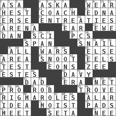 ACROSS 1. White ___ sheet 4. "____ silly question..." 8. Erode 12. Command 14. Team commander 16. Pulitzer Prize-winning author Ferber 17. Celtic language 18. Pleas 20. Sports stadium 22. Ewer handle 23. She-sheep 24. Daniel's nick name 25. _-fi 28. Personal Computers (abbr.) 30. Connect, as a bridge 31. Slow-paced one 35. 100% 37. Armed conflicts 40. Otherwise 41. Length times width 42. Snout, nose 44. Snakelike fish 45. Trial 46. Immeasurably long periods of time 47. Last letter of the English alphabet 48. _____ Park, CO 50. _ Jones' Locker 52. June honoree 54. Period 55. Fish or hair follower 58. Adept person 61. Director Reiner 63. Collection of objects 65. Complicated, petty procedures 70. Having or resembling wings 71. The main thing one is thinking about 72. Damp 73. Writing tablets 74. Confront 75. Bristle 76. Born DOWN 1. Forward in time 2. Father Junipero _ 3. NE Netherlands city 4. Adept person 5. Male child 6. Krazy ___ of comics 7. Land measure 8. Soggy 9. Singer Brickell 10. Afresh 11. To erase 13. Nine, plus one 15. Pile 19. Arches 21. Cleo's killer 26. Crow sounds 27. Empty; void 29. Dwarf with a sinus problem 30. Scheduled 32. Toward shelter 33. Capri or Wright 34. French article 35. Ancient Greek god of war 36. For fear that 38. Friend of Pooh 39. Something which is sent 41. Had dinner 43. Russian ruler of old 49. "Two Mules for Sister ____" 51. Large container 53. Dormintory (informal) 55. Pitcher Ryan 56. Dodge 57. Laconic 58. Demure 59. Travel on an animal 60. Double curve, resembling the letter S 62. Expressions of contempt or scorn 64. Strike 66. Floor covering 67. Falsehood 68. Eastern Standard Time (abbr.) 69. R.R. building