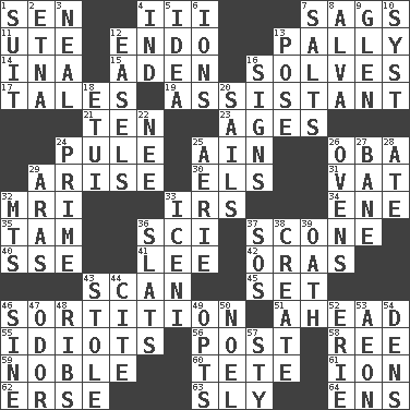 ACROSS 1. Elected rep. 4. One more than two 7. Sinks 11. Shoshoni 12. Inside; within (prefix) 13. Chummy 14. _ tizzy (2 wds.) 15. Arabian gulf 16. Finds the solution 17. Lies 19. Aide 21. "___ Little Indians" 23. Grows older 24. Whine 25. The 18th letter of the Arabic alphabet 26. Chief or king in Benin or Nigeria 29. Get up 30. Raised railways 31. Large container 32. Medical imaging device (abbr.) 33. Big collection agency 34. Compass dir. 35. Scottish cap 36. _-fi 37. Biscuitlike quick bread 40. Compass dir. 41. Area sheltered from the wind 42. Mouths or openings 43. Glance over 45. Arrange properly for use 46. Making a chance decision by using lots 51. Having the leading position 55. Foolish or stupid persons 56. Mail 58. Portuguese money of account (variant) 59. Having high moral qualities 60. False hair 61. Electrically charged atom 62. Celtic language 63. Stealthy 64. Followers of ems DOWN 1. Set of matching outer garments 2. Inactive volcano in Sicily 3. Anneal 4. Indiana (abbr.) 5. The content of cognition 6. Charged particles 7. Table seasonings 8. Inventor's middle name 9. Small, secluded valley 10. System (abbr.) 12. Artist's stands 13. Airs 16. Omens 18. Needle case 20. Moves on water 22. Born 24. A-one 25. Nest on high 26. Baking chambers 27. Object of repulsion 28. Had dinner 29. Caspian sea tributary 32. Mountains (abbr.) 33. Ancient Celtic tribe of eastern Britain 36. Narrow boards 37. Distress signal 38. Make 39. Pledge 43. Fur scarf 44. Quote 46. Trig term 47. Scent 48. Teases 49. Chooses 50. Christmas carol 52. One of the Great Lakes 53. Period of immesurable duration 54. Hiding places for outlaws 57. Filthy place