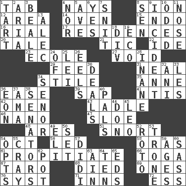 ACROSS 1. Bar bill 4. Negative votes 8. The Jewish people; Israel 12. Type of rug 14. Baking chamber 15. Inside; within (prefix) 16. Monetary unit of Yemen 17. Homes 20. Falsehood 21. Nervous spasm 22. Binary compound 23. Learning spot: Fr. 27. Nothingness 29. Nourish 31. Actress Patricia 34. Vertical member of a panel or frame 35. Singer Murray 36. Relaxation 39. Plant excrement 41. Nuclear Threat Initiatives 42. Sign of something about to happen 43. Dipping utensil 46. Billionth: prefix 47. _ gin 48. Ancient Greek god of war 51. Derisive sound 54. Sep. follower 56. Directed 58. Mouths or openings 61. Appease 66. Ancient Roman robe 67. Pacific island yam 68. Passed on 69. Singles 70. System (abbr.) 71. Restaurants 72. Double-curved letter DOWN 1. Small pie 2. Roberta Peters solo 3. Memphis, Tenn. Street 4. Or not 5. "___ Maria" 6. It is so 7. In a ____ (agitated or irritated) 8. Elected rep. 9. Happening 10. Wrote a lyric poem 11. Characteristic smell of wine 13. Actor Baldwin 18. HTML Container Element 19. Environmental prefix 24. Often (poetically) 25. Luau accessory 26. Snakelike fish 28. Empty; void 30. Allots cards 32. Black tropical American cuckoo 33. French article 34. Sir (Sp.) 36. A really long time 37. Wet nurse (var.) 38. Elected representatives 40. Friends 44. Spanish title 45. Lion 49. Biblical high priest 50. Arrange properly for use 52. Printing process, for short 53. Heavy duty weighing machine 54. Chooses 55. Supercomputer manufacturer 57. "You Light Up My Life" star Conn 59. Ripens 60. Backtalk 62. Cooking vessel 63. The 18th letter of the Arabic alphabet 64. "___ Little Indians" 65. Begley and Asner