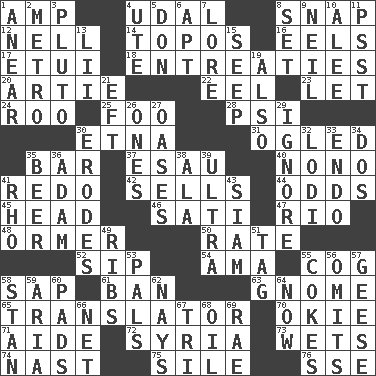 ACROSS 1. Electrical Unit 4. Hereditary estate 8. Fastener 12. 1994 drama film starring Jodie Foster 14. Literary convention 16. Snakelike fish 17. Needle case 18. Pleas 20. Nick name for Arthur 22. Snakelike fish 23. Allow 24. Friend of Pooh 25. Egg _ yung 28. 23rd letter of the Greek alphabet 30. Inactive volcano in Sicily 31. Stared at amorously 35. Soap unit 37. He sold his birthright 40. Words to Nanette 41. Make new 42. Makes a sale 44. Probability 45. Froth on beer 46. Suttee (variant) 47. _ de Janeiro 48. Abalone 50. Pace 52. Small drink 54. Housemaid (var.) 55. Gear tooth 58. Plant excrement 61. Bar 63. Dwarf 65. Interpreter 70. Migrant worker of the '30s 71. Helper 72. Damascus' land 73. Moistens 74. Political cartoonist Thomas 75. Filth; sediment 76. Compass dir. DOWN 1. Approach 2. Paris' subway 3. Mickey's pet 4. Shoshoni 5. Spanish title 6. Fitting 7. Old wives' tales, e.g. 8. Arrange properly for use 9. Famous astronaut Armstrong 10. Toward shelter 11. Inconspicuous attention getter 13. Cards in a Roman deck? 15. Ooze 19. In addition 21. Newt 26. Singles 27. Fertile tracts in a desert 29. Snub 30. Eats (away) 32. Farming town in central California 33. Inside; within (prefix) 34. Two (Sp.) 35. Fermented drink made from hops 36. First man 38. Chicken ___ king 39. Extremist 41. 17th letter of the Greek alphabet 43. Thailand, formerly 49. Teases 51. Label 53. Friends 55. Popular sodas 56. Leaves out 57. Honkers 58. Comedian Laurel of Laurel & Hardy 59. Roberta Peters solo 60. Groovy apts. 62. Negative votes 64. Immediately 66. Fish or hair follower 67. Three (prefix) 68. Petroleum 69. Actress Charlotte