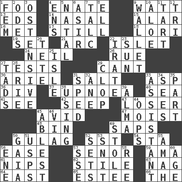 ACROSS 1. Egg _ yung 4. Related on the mother's side 9. Electrical Unit 13. Begley and Asner 14. Relating to the nose 15. Having or resembling wings 16. Was introduced to 17. Not moving 18. Australian parrot (variant) 19. Put into a specified state 21. Curve 22. Small island 24. Famous astronaut Armstrong 26. Sorrow 27. Trials 29. Patter 30. Satellite of Uranus 31. Table seasoning 33. Cleo's killer 36. HTML Container Element 37. Normal relaxed breathing 40. Ocean 41. Perceive with the eye 42. Ooze 43. Failure 45. Enthusiastic 47. Damp 48. Storage container 49. Plant excrements 50. Russian prison camp 52. Fast jet (abbr.) 54. R.R. building 56. Relaxation 57. Sir (Sp.) 59. Nanny (var.) 61. Cuts off 62. Vertical member of a panel or frame 63. Tired old horse 64. Compass direction 65. First name in cosmetics 66. Definite Article DOWN 1. Opposite of masc. 2. Lyric poems 3. Clearly or manifestly demonstrative 4. Followers of ems 5. Brizilian seaport 6. SW Saudi Arabia district 7. Baby powder 8. Pipe bend 9. Place for singles 10. _ vera 11. Small pie 12. Three (prefix) 20. Wig 22. Feeling or showing extreme anger 23. Player for Phoenix 25. Small island 27. Small boys 28. One of the Great Lakes 29. Hoof sound 31. Drove too fast 32. A saturated hydrocarbon 33. Helper 34. Perceives with the eye 35. Piece 38. Putting into practice 39. _ mater 44. I made a mistake 45. Most capable 46. By way of 49. Took without asking 50. Greek goddess of the earth (variant) 51. United States Postal Service (abbr.) 52. Puts into a specified state 53. In a ____ (agitated or irritated) 55. Nursemaid 56. Compass dir. 57. Compass dir. 58. Portuguese money of account (variant) 60. Ripen