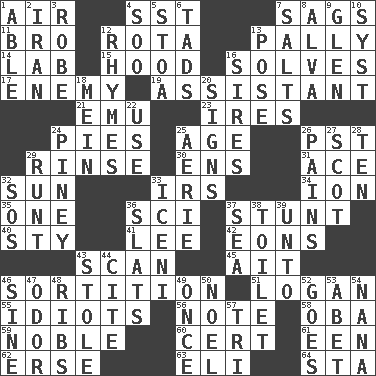 ACROSS 1. Wind 4. Fast jet (abbr.) 7. Droops 11. Sis' sibling 12. Round or rotation of duties 13. Friendly 14. Experiment locale 15. Parka part 16. Finds the solution 17. Foe 19. Helper 21. Australian flightless bird 23. Angers 24. Sliced desserts 25. Mature 26. Pacific Standard Time (abbr.) 29. Wash lightly 30. Followers of ems 31. Adept person 32. Player for Phoenix 33. Big collection agency 34. Electrically charged atom 35. Single 36. _-fi 37. Check the growth or development of 40. Filthy place 41. Area sheltered from the wind 42. Immeasurably long periods of time 43. Examine minutely or intensely 45. Small island 46. Decision 51. Utah city north of Ogden 55. Foolish or stupid persons 56. Musical sound 58. Chief or king in Benin or Nigeria 59. Having high moral qualities 60. Foregone conclusion 61. Car or cant ending 62. Celtic language 63. Biblical high priest 64. R.R. building DOWN 1. Competent 2. SW Asia republic 3. Loose flowing garment 4. "Barney Miller" actor Jack 5. Portico 6. Bits 7. Table seasonings 8. Inventor's middle name 9. Small, secluded valley 10. System (abbr.) 12. Poems 13. Introduce or present, as a question 16. Fathers 18. Chow _ 20. Signals 22. Purpose 24. Abounding in pines 25. Nest on high 26. Aches 27. Native of Scotland 28. Nine, plus one 29. Undersized animal 32. Distress signal 33. Ancient Celtic tribe of eastern Britain 36. Narrow boards 37. Ocean 38. Bathroom plumbing fixture 39. To (old English) 43. Took without asking 44. Quote 46. Trig term 47. Scent 48. Chest bones 49. Single time 50. Christmas carol 52. Travels 53. Collude with 54. Grandmother 57. Three (prefix)