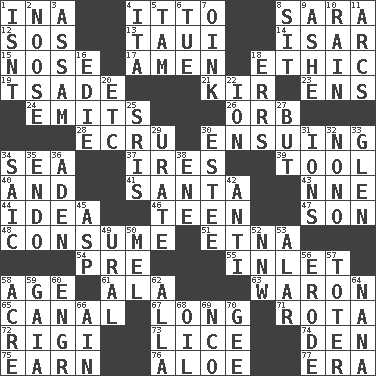 ACROSS 1. _ tizzy (2 wds.) 4. "Tell ____ the Marines!" 8. "Two Mules for Sister ____" 12. Mayday 13. "Change" in Tahitian 14. Austrian river, tributary to the Danube 15. Sense of smell 17. So be it 18. Principle of right and wrong 19. Sadhe (variant) 21. Apertif with cassis 23. Followers of ems 24. Gives off 26. Globe 28. Shade of tan 30. Taking place subsequently 34. Ocean 37. Angers 39. Implement 40. Plus 41. Before Barbara or Clara 43. Compass dir. 44. The main thing one is thinking about 46. Adolescent 47. Manchild 48. Ingest 51. Inactive volcano in Sicily 54. Before (prefix) 55. An arm off of a larger body of water 58. Personal question 61. Insect wing 63. Make _____ (do battle with) 65. Lessep's creation 67. Yearn 71. Round or rotation of duties 72. Swiss mountan, "Queen of the Mountains" 73. Louse (plural) 74. Lair 75. Merit 76. Medicinal plant 77. Period DOWN 1. Is not 2. Trap for birds or small mammals 3. Indian state 4. Call ___ day 5. Scottish cap 6. Third day of the wk. 7. Pig sound 8. Be seated 9. American tennis player Robert 10. Water falling in drops from the sky 11. Arches 16. Singer Brickell 18. Blunders 20. And so on (abbr.) 22. Electrically charged atom 25. Indian titles of respect 27. With the exception that 29. A salt of uric acid 30. First name in cosmetics 31. Charged atoms 32. Words to Nanette 33. Small, secluded valley 34. Ketch in the Levant 35. Inside; within (prefix) 36. An important port of Yemen 38. Compass dir. 42. Opposed to 45. Cleo's killer 49. Mountain range 50. Cartoonist voice _ Blanc 52. Compass dir. 53. Having or resembling wings 56. Wear away 57. Carrier 58. 1/640 square mile 59. Greek goddess of the earth (variant) 60. Engineer (abbr.) 62. Silent film actress Nazimova 64. Grandmother 66. The 18th letter of the Arabic alphabet 68. Lubricate 69. Non-commissioned officer (abbr.) 70. Turn to the right