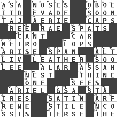 ACROSS 1. White ___ sheet 4. Olfactory organs 9. Mitch Miller's instrument 13. It would 14. Dodge 15. Within a short period 16. _ Mahal 17. Nest on high 18. Smile enhancers 19. Portuguese money of account (variant) 21. Actress Charlotte 22. Arguments over trivial matters 24. Patter 26. Automobile 27. Paris' subway 29. Chops off 30. Originate 31. Connect, as a bridge 33. Keyboard modifier key 36. 54 in ancient Rome 37. Cordwainer's material 40. "Barney Miller" actor Jack 41. Area sheltered from the wind 42. Having or resembling wings 43. Indian state 45. Egg locale 47. One or ones belonging to thee 48. Single 49. Observes 50. Satellite of Uranus 52. Girls' org. (abbr.) 54. R.R. building 56. Angers 57. Smooth fabric 59. Sandy's bark 61. French philosopher Descartes 62. Vertical member of a panel or frame 63. Non-commissioned officer (abbr.) 64. Fast planes 65. Laconic 66. Definite Article DOWN 1. Small island 2. Play the lead 3. Descriptive word 4. Teachers' org. 5. Unconcealed 6. "Two Mules for Sister ____" 7. Singer Brickell 8. Perceive with the eye 9. Motion picture awards 10. Water vessel 11. I made a mistake 12. Followers of ems 20. Hearing organs 22. Biscuitlike quick bread 23. Infant food 25. Christmas carol 27. Promenade 28. One of the Great Lakes 29. Cowardly lion portrayer 31. Table seasoning 32. Parent Teacher Association (abbr.) 33. Helper 34. Grant temporary use of 35. Heavy book 38. Artist's stand 39. Pace 44. "______ My Girl" (Turtles hit) 45. Annoying sounds 46. Compass dir. 49. Travel by water 50. Ancient Greek god of war 51. Monthly bill 52. Yard entry 53. Agitate 55. Bowlike part 56. Big collection agency 57. Fast jet (abbr.) 58. Born 60. Enemy