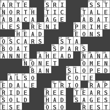 ACROSS 1. Johnson of "Laugh-In" 5. Indian title of respect (Mr.) 8. Fast jet (abbr.) 11. 0 degrees 13. Nervous spasm 14. Lie 15. Phillipine bananalike plant 16. Personal question 17. Blind as ____ 18. French article 19. Painter Guido (1575-1642) 21. First class 22. Froth on beer 24. Immeasurably long periods of time 25. Motion picture awards 27. R.R. building 29. Water vessel 30. Practice fights 32. Singer Murray 33. Forward in time 35. Nanny 39. Music written for nine 41. Sign of something about to happen 42. Bar 43. Inclined 45. In addition 48. ____ d'Azur (French Riviera) 49. Peak District village in England 50. Musical group of three 52. Strike 55. Travel on or in a vehicle 56. To separate or throw off 57. Pulls into pieces 59. Exchanged or delivered for money 60. Possessed 61. Gurus 62. Compass dir. 63. Bear (Spanish) 64. Remainder DOWN 1. Of or related to the anus 2. Loose flowing garment 3. File 13 4. And so on (abbr.) 5. Comedian Laurel of Laurel & Hardy 6. Swiss mountan, "Queen of the Mountains" 7. Frozen water 8. Unit of acoustic absorption 9. Shuts with force 10. Wig 12. Ethiopian city, capital of Harari 14. Edible starchy tuberous root 20. Begley and Asner 21. Lightbulb-shaped fruit 23. Eroded 25. Chief or king in Benin or Nigeria 26. Male offspring 27. Health resort 28. Small boy 30. Put into a specified state 31. Snout, nose 33. Santa ___, CA 34. Layer 36. Electrical Measurement 37. Born 38. Added to 40. Mitch Miller's instrument 43. _-fi 44. Plunders 45. Goodbye (Sp.) 46. Dipping utensil 47. Downhill vehicle 49. Celtic language 50. Beverages made from leaves 51. Do over again 53. Ancient Greek god of war 54. Inconspicuous attention getter 56. 17th letter of the Greek alphabet 58. Hearing organ