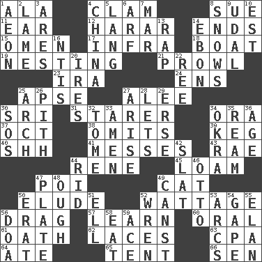 ACROSS 1. Chicken ___ king 4. Burrowing marine mollusk 8. Take to court 11. Hearing organ 12. Ethiopian city, capital of Harari 14. Extremities 15. Sign of something about to happen 17. Kind of red light 18. Water vessel 19. Snuggling 21. Move like a hungry wolf 23. Lyricist Gershwin 24. Followers of ems 25. Domed church section 27. Toward shelter 30. _ Lanka 31. A viewer who gazes fixedly 34. Mouth or opening 37. Sep. follower 38. Leaves out 39. Cask 40. Quiet! 41. Makes clutter 43. Actress Charlotte 44. French philosopher Descartes 45. Rich soil 47. Luau course 49. Domesticated feline 50. Dodge 52. Electrical Measurement 56. To trail on the ground 57. Acquire or gain knowledge or skills 60. Taken by mouth 61. Pledge 62. Shoestrings 63. Numbers guy (abbr.) 64. Had dinner 65. Portable shelter 66. Elected rep. DOWN 1. A really long time 2. Unable to walk 3. Ancient Greek god of war 4. Large country 5. Long (Scottish) 6. Sandy's bark 7. Third mo. 8. Overwhelms 9. Hereditary estate 10. Eastern Standard Time (abbr.) 13. Strike 14. Inky black, to poets 16. Nuclear Threat Initiatives 20. Angers 22. To riddle 25. Bowlike part 26. Heart or essence 27. Get up 28. Allows 29. Celtic language 30. Distress signal 32. Heavy book 33. So be it 34. Gumbo ingredient 35. 480, 500 or 516 sheets of paper 36. Personal question 42. Narrow board 44. To free from 46. "Beetle Bailey" pooch 47. Food holder 48. Ending for "Through" and "Enough" 49. 2nd pers. sing. pres. of can (arch.) 50. Part of Q.E.F. 51. Pipe bend 52. Songbird 53. Curves 54. Open wide 55. Flair 56. ___ good deed 58. Ingest 59. Adept person