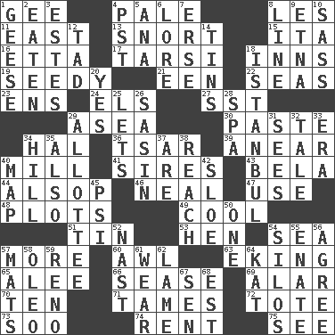 ACROSS 1. Unit of force equal to gravity 4. Diluted with white 8. French article 11. Compass direction 13. Derisive sound 15. Call ___ day 16. Singer James 17. Tarsus (plural) 18. Restaurants 19. Full of seeds 21. Car or cant ending 22. Oceans 23. Followers of ems 24. Raised railways 27. Fast jet (abbr.) 29. At sea 30. Thick mixture 34. Actor Linden 36. Russian ruler of old 39. Approach 40. Place where flour is made 41. Fathers 43. Actor Lugosi 44. Columnist Joseph or Stewart 46. Be tempered by heat 47. Purpose 48. Secret plans 49. Calm and collected 51. Metal container 53. Layer 54. Ocean 57. Greater amount 60. Leather borer 63. Supplementing with great effort 65. Toward shelter 66. Gospel singer Marvin 69. Having or resembling wings 70. "___ Little Indians" 71. Softens 72. Haul 73. "Barney Miller" actor Jack 74. Monthly bill 75. Observe DOWN 1. Honkers 2. Eroded 3. _____ Park, CO 4. Pacific Standard Time (abbr.) 5. Santa ___, CA 6. Old wives' tales, e.g. 7. Celtic language 8. Actor's bit 9. Inactive volcano in Sicily 10. Backtalk 12. Bit 14. Metal containers 18. Byzantium, centuries later 20. Affirmative reply 25. Allows 26. Indian antelope 28. Health resort 29. One to whom something is allotted 31. Observes 32. Story 33. Epoch 34. Land elevation 35. In addition 37. "We ___ not amused" (Victoria) 38. Arrive at 40. Atlas unit 42. _ gin 45. Air pressure measure (abbr.) 50. Single 52. Political cartoonist Thomas 54. Grain storage towers 55. Maternal 56. Match 57. Floor coverings 58. Butter sub 59. Western Nevada city 61. Erode 62. Unable to walk 64. Krazy ___ of comics 67. Elected rep. 68. Eastern Standard Time (abbr.)