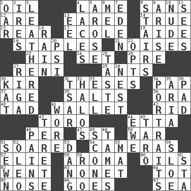 ACROSS 1. Petroleum 4. Unable to walk 8. Without 12. "We ___ not amused" (Victoria) 13. Having ears or earlike features 14. Loyal 15. Rump 17. Learning spot: Fr. 18. Assistant 19. Paper fasteners 21. Annoying sounds 23. Part of HMS, perhaps 24. Arrange properly for use 26. Before (prefix) 27. Painter Guido (1575-1642) 28. Pismires 30. Apertif with cassis 31. College papers 34. Infant food 37. Ripen 38. Table seasonings 39. Mouth or opening 40. Bit 41. Place for singles 42. To free from 43. "Corrida" creature 44. Singer James 46. For each 47. Fast jet (abbr.) 50. Armed conflict 51. Flew 54. Devices for capturing images 57. Writer Wiesel 58. Odor 60. Lubricates 62. Gone 63. Music written for nine 64. Small child 65. Sense of smell 66. Moves 67. Ocean DOWN 1. Boat paddle 2. Angers 3. Resembling or made to resemble leather 4. Shoestrings 5. Came up 6. Cartoonist voice _ Blanc 7. Genesis locale 8. Flight of steps 9. Originate 10. Unadorned 11. Perceives with the eye 13. Snakelike fish 16. Precipitation 20. Air pressure measure (abbr.) 22. Elects 25. Clothes sense 27. Capital of Latvia 29. A home for chicks 30. Krazy ___ of comics 31. Russian ruler of old 32. Auras 33. Pipe bend 34. Likenesses of persons 35. Operatic vocal solo 36. Writing tablet 41. Had on 43. Cigar-shaped 44. She-sheep 45. Pacific island yam 46. Aches 48. Biscuitlike quick bread 49. Makes less strong or intense 51. Stitched 52. Margarine 53. Mild oath, euphamism for damn 55. Floor protector 56. A type of plum 59. Friend of Pooh 61. R.R. building