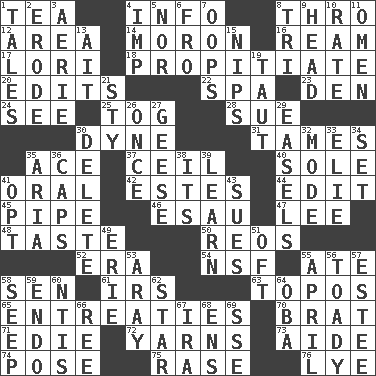 ACROSS 1. Beverage made from leaves 4. A message received and understood 8. Through, poetically 12. Type of rug 14. Person of subnormal intelligence 16. 480, 500 or 516 sheets of paper 17. Australian parrot (variant) 18. Conciliate 20. Prepares for publication 22. Health resort 23. Lair 24. Observe 25. Coat; cloak 28. Institute legal proceedings 30. Unit of force 31. Makes less strong or intense 35. Adept person 37. To provide with a ceiling 40. Flatfish 41. Relating to the mouth 42. _____ Park, CO 44. Prepare for publication 45. Corncob 46. He sold his birthright 47. Area sheltered from the wind 48. Clothes sense 50. Vintage cars 52. Period 54. Science/research agcy. 55. Had dinner 58. Elected rep. 61. Big collection agency 63. Traditional theme or motif 65. Pleas 70. Naughty child 71. Singer Brickell 72. Tall tales 73. Assistant 74. Airs 75. Raze (variant) 76. Sodium hydroxide DOWN 1. Falsehoods 2. Eat (away) 3. Nest on high 4. Mischievous child 5. Or not 6. From 7. I made a mistake 8. Three (prefix) 9. Froth on beer 10. Assign a rank or rating to 11. Presage 13. Small island 15. Cuts off 19. Tense 21. Filthy place 26. Single time 27. Honkers 29. Artist's stands 30. Erase 32. Method 33. Writer Wiesel 34. Arrange properly for use 35. Roberta Peters solo 36. Smile enhancers 38. It is 39. Acquire or gain knowledge or skills 41. Elect 43. Institutes legal proceedings 49. One of the Great Lakes 51. Often (poetically) 53. Like ___ of sunshine 55. Showery time 56. Sycophant 57. First name in cosmetics 58. Ooze 59. Inside; within (prefix) 60. Nuclear Threat Initiatives 62. Play the lead 64. Chief or king in Benin or Nigeria 66. Portuguese money of account (variant) 67. Retirement account (abbr.) 68. Followers of ems 69. Compass dir.