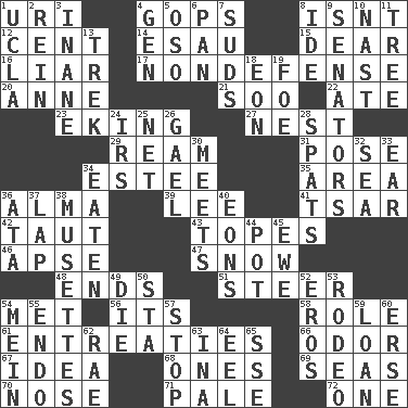 ACROSS 1. RI univ. 4. Republicans 8. Is not 12. Penny 14. Son of Isaac 15. Letter starter 16. One who doesn't tell the truth 17. Unrelated to defense, as in spending 20. Queen of England 1702-14 21. "Barney Miller" actor Jack 22. Had dinner 23. Supplementing with great effort 27. Egg locale 29. 480, 500 or 516 sheets of paper 31. Introduce or present, as a question 34. First name in cosmetics 35. Length times width 36. _ mater 39. Area sheltered from the wind 41. Russian ruler of old 42. Strained 43. Drinks excessively 46. Domed church section 47. Overwhelm 48. Extremities 51. Guide 54. Was introduced to 56. It is 58. Hero or heavy, e.g. 61. Pleas 66. Aroma 67. It may be bright or harebrained 68. Singles 69. Oceans 70. Characteristic smell of wine 71. Diluted with white 72. Single DOWN 1. Southern CA. univ. 2. It's straight from the horse's mouth 3. Silly 4. Commissioned military rank (abbr.) 5. Bear (Spanish) 6. Baking dish 7. Soap bubbles 8. Binary compound 9. Elected representatives 10. Political cartoonist Thomas 11. Family _ (genealogy) 13. Long journey 18. A really long time 19. Enemy 24. Big collection agency 25. Fish or hair follower 26. Highlander 28. Arguments over trivial matters 30. Confronts 32. Ocean 33. Ewer handle 34. Ingested 36. _ moment's notice (2 wds.) 37. Pet locale 38. French bagpipes 40. Immeasurably long periods of time 44. Plant holder 45. She-sheep 49. Pass on 50. R.R. building 52. Greek god of love 53. Cowboy competition 54. Count _ (2 wds.) 55. Inside; within (prefix) 57. Discontinue 59. Grant temporary use of 60. Celtic language 62. Actress Charlotte 63. _ tizzy (2 wds.) 64. Snakelike fish 65. Compass dir.