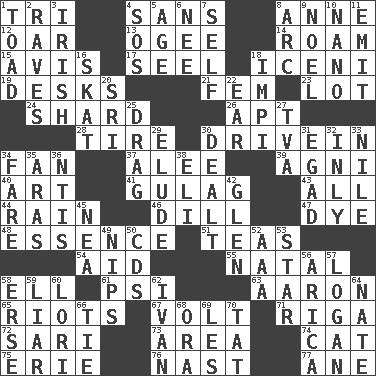 ACROSS 1. Three (prefix) 4. Without 8. Queen of England 1702-14 12. Rowing implement 13. Double curve, resembling the letter S 14. Wander aimlessly 15. Deliberation 17. Stitch closed the eyes of (a falcon) 18. Ancient Celtic tribe of eastern Britain 19. Writing tables 21. Opposite of masc. 23. Car dealer's back yard 24. Broken piece 26. Fitting 28. Hoop that covers a wheel 30. Popular '50s hangout 34. Avid follower 37. Toward shelter 39. Hindu god of fire 40. Tate display 41. Russian prison camp 43. 100% 44. Water falling in drops from the sky 46. Deli pickle 47. Color 48. Substance 51. Beverages made from leaves 54. Help 55. Brizilian seaport 58. Pipe bend 61. 23rd letter of the Greek alphabet 63. Composer Copland 65. Debaucheries 67. Electrical Unit 71. Port city in Latvia 72. Indian skirt 73. Type of rug 74. Domesticated feline 75. One of the Great Lakes 76. Political cartoonist Thomas 77. A saturated hydrocarbon DOWN 1. Frog relative 2. All-night dance parties 3. From or relating to Ireland 4. Mayday 5. Ripen 6. Born 7. Oneself 8. Curve 9. Christmas carol 10. Billionth: prefix 11. Give off 16. Three-handed card game 18. Body of Kaffir warriors 20. _ Lanka 22. Hearing organ 25. To be drawn or hauled along 27. Federal power corp. 29. Evade 30. Started a card game 31. Mild oath 32. In an inward manner 33. "Death on the ____" 34. Conductor's collection 35. Ancient river in northeast Turkey 36. Nuclear Threat Initiatives 38. Connecticut Ivy Leaguer 42. Small, secluded valley 45. Teachers' org. 49. Pinches, bites 50. Music discs 52. American Automobile Association (abbr.) 53. Play the lead 56. N. Chile seaport 57. Utah city north of Ogden 58. Celtic language 59. One who doesn't tell the truth 60. Australian parrot (variant) 62. _ the terrible 64. Nathan's nickname 66. Neckwear 68. Mouth or opening 69. French article 70. Make lace