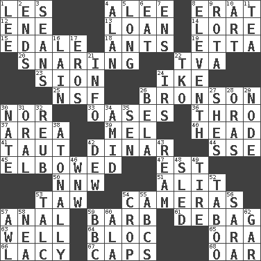 ACROSS 1. French article 4. Toward shelter 8. Part of Q.E.F. 12. Compass dir. 13. Grant temporary use of 14. Old wives' tales, e.g. 15. Peak District village in England 18. Pismires 19. Singer James 20. Catching in a trap 22. Federal power corp. 23. The Jewish people; Israel 24. Eisenhower's nickname 25. Overdraft (abbr.) 26. "Death Wish" actor 30. Or not 33. Fertile tracts in a desert 36. Through, poetically 37. Length times width 39. Cartoonist voice _ Blanc 40. Froth on beer 41. Drawn tight 42. Middle Eastern gold or silver currency 44. Compass dir. 45. Shoved, as through a crowd 47. Eastern Standard Time (abbr.) 50. Compass dir. 51. Set down 53. The 23rd letter of the Hebrew alphabet 54. Devices for capturing images 57. Of or related to the anus 59. Sharp remark 61. Debunk (Brit. slang) 63. Not ill 64. Coalition 65. Mouth or opening 66. Made of lace 67. Balmoral and tarboosh 68. Boat paddle DOWN 1. Area sheltered from the wind 2. Extremities 3. Actors Connery and Penn 4. Actor Alda or Thicke 5. Having great length 6. Erode 7. Followers of ems 8. Veterans Day date 9. Round or rotation of duties 10. Tate display 11. Afternoon social gathering 16. (Had) reclined 17. Greek god of love 21. Information 22. Ring climax 24. Big collection agency 26. Actor Lugosi 27. "______ My Girl" (Turtles hit) 28. Mouths or openings 29. Thickened enlargement 30. Nathan's nickname 31. Spoken 32. Reuben's nickname 34. Among 35. Elected rep. 38. Without tonality 42. Morning condensation 43. 480, 500 or 516 sheets of paper 46. Compass dir. 48. Downhill vehicle 49. Become fatigued 52. Off limits 53. Baby powder 54. Riding implement 55. Lettered men learn these first 56. "Two Mules for Sister ____" 57. Leather borer 58. Teachers' org. 59. English channel? 60. In the manner of 62. Slender fish