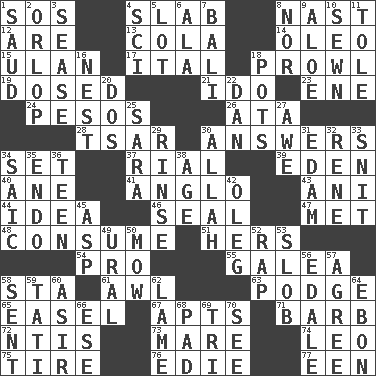 ACROSS 1. Distress signal 4. Broad, flat, thick piece 8. Political cartoonist Thomas 12. "We ___ not amused" (Victoria) 13. Root beer relative 14. Margarine 15. Uhlan (variant) 17. Slanted text style (abbr.) 18. Move like a hungry wolf 19. Administered medicine 21. Wedding promise 23. Compass dir. 24. Mexican monetary units 26. _ moment's notice (2 wds.) 28. Russian ruler of old 30. Replies (to) 34. Arrange properly for use 37. Monetary unit of Yemen 39. Genesis locale 40. A saturated hydrocarbon 41. White American of non-Hispanic descent 43. Cuckoo 44. The main thing one is thinking about 46. Lick closed 47. Was introduced to 48. Ingest 51. Possessive pronoun 54. Adept person 55. An organ shaped like a helmet 58. R.R. building 61. Leather borer 63. Puddle 65. Artist's stand 67. Tenement units (abbr.) 71. Sharp remark 72. Nuclear Threat Initiatives 73. Female horse 74. Lion 75. Become fatigued 76. Singer Brickell 77. Car or cant ending DOWN 1. Saudi Arabian king (1953-1964) 2. Lowest deck of a ship 3. Gospel singer Marvin 4. _-fi 5. Car dealer's back yard 6. Chicken ___ king 7. Indonesian resort city 8. Not either 9. Medicinal plant 10. Stitched 11. Lacquered or enameled metalware 16. A home for chicks 18. Plant holders 20. Two (Sp.) 22. One of the 12 tribes of Israel 25. "Two Mules for Sister ____" 27. Deep reverence 29. Remove soap 30. Assad's deity 31. Dutch treat 32. French philosopher Descartes 33. In a ____ (agitated or irritated) 34. Ketch in the Levant 35. Inside; within (prefix) 36. Adolescent 38. Personal question 42. Cassini of fashion 45. Cleo's killer 49. Mountain range 50. Cut the grass 52. Reproach for some lapse or misdeed 53. Messy guy 56. Peak District village in England 57. Match 58. Posted 59. Jacques of French films 60. SW Saudi Arabia district 62. Unable to walk 64. Inky black, to poets 66. Compass dir. 68. Writing tablet 69. Three (prefix) 70. Observe
