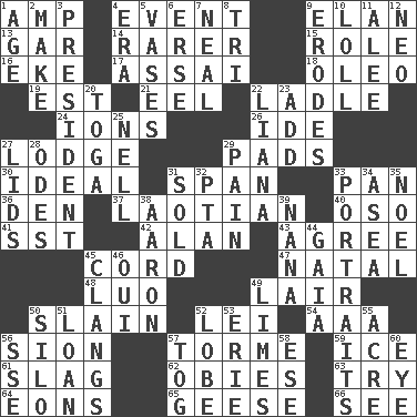 ACROSS 1. Electrical Unit 4. Happening 9. Enthusiasm 13. Slender fish 14. More valued for its uncommonness 15. Hero or heavy, e.g. 16. Supplement with great effort 17. Slender Brazilian palm 18. Margarine 19. Eastern Standard Time (abbr.) 21. Snakelike fish 22. Dipping utensil 24. Charged particles 26. Binary compound 27. Inn 29. Writing tablets 30. Perfect 31. Connect, as a bridge 33. Baking dish 36. Lair 37. Of or relating to Laos or its people 40. Bear (Spanish) 41. Fast jet (abbr.) 42. ____ Jay Lerner 43. Match 45. Drawstring 47. Relating to or accompanying birth 48. Nilotic language 49. Den 50. Killed 52. Flowery wreath 54. American Automobile Association (abbr.) 56. The Jewish people; Israel 57. Singer Mel 59. Frozen water 61. Volcanic refuse 62. Off-Broadway awards 63. Attempt 64. Immeasurably long periods of time 65. Honkers 66. Observe DOWN 1. Mature 2. Cause to be 3. Elected leader of a country 4. Epoch 5. Flower holders 6. Celtic language 7. Be tempered by heat 8. Three (prefix) 9. Eats (away) 10. Hang loosely or laxly 11. Toward shelter 12. Modern: prefix 20. Ancient Roman robe 22. Woody, climbing, usually tropical plant 23. Say or write further 25. 1994 drama film starring Jodie Foster 27. Flaplike coverings 28. Lyric poems 29. Ache 31. Exchanged or delivered for money 32. Parent Teacher Association (abbr.) 33. Likenesses of persons 34. Toward the sea 35. Christmas carol 38. Composer Copland 39. Nanny 44. Greek goddess of the earth (variant) 45. Gives out a loud, resonant sound 46. Fr. "Yes" 49. Citrus fruits 50. Grain storage tower 51. Grant temporary use of 52. Ear part 53. One of the Great Lakes 55. 43,560 square feet 56. Compass dir. 57. Coat; cloak 58. Compass dir. 60. Sight organ
