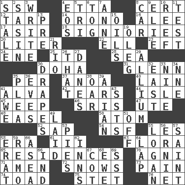 ACROSS 1. Compass dir. 4. Singer James 8. Sure thing 12. Canvas cover 14. U. of Maine site 16. Toward shelter 17. SW Saudi Arabia district 18. Seigniories (variant) 20. 61 cubic inches 22. Pipe bend 23. Bank Draft (abbr.) 24. Compass dir. 25. It would 28. Ocean 30. Capital of the state of Qatar 31. American astronaut and politician John 35. For each 37. Small Philippine buffalo 40. (Had) reclined 41. Inventor's middle name 42. Lacerates 44. Capri or Wright 45. Shed a tear 46. Indian titles of respect 47. Shoshoni 48. Artist's stand 50. Tiny particle 52. Plant excrement 54. Science/research agcy. 55. French article 58. Epoch 61. One more than two 63. Plants 65. Homes 70. Hindu god of fire 71. So be it 72. Frozen precipitation (plural) 73. Ache 74. Frog relative 75. Proofreading order 76. Fish or hair follower DOWN 1. Having lost freshness 2. Indian antelope 3. Compose 4. Greek goddess of the dawn 5. Three (prefix) 6. Coat; cloak 7. Singer Murray 8. Automobile 9. Writer Wiesel 10. Coral collection 11. Trial 13. Before (prefix) 15. Petroleums 19. Cassini of fashion 21. _ de Janeiro 26. Not this but _ 27. Natives or inhabitants of Denmark 29. Plant genus of onion and garlic 30. Window treatments 32. 90 degrees 33. "Death on the ____" 34. Compass dir. 35. Entreaty 36. Nights before holidays 38. Boat paddle 39. Believer in; advocate of (suffix) 41. Deep reverence 43. Fast planes 49. Put down 51. No longer planned or scheduled 53. Sliced desserts 55. Utah city north of Ogden 56. Bert's buddy 57. Inhabitant of Heaven 58. Part of Q.E.F. 59. San ____ (Riviera town) 60. At sea 62. Taverns 64. Pet locale 66. Working for oneself (abbr.) 67. Small bed 68. She-sheep 69. Fast jet (abbr.)