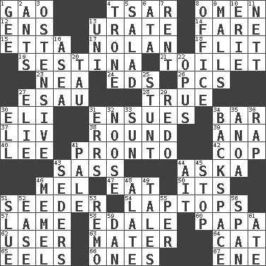 ACROSS 1. E Mali city 4. Russian ruler of old 8. Sign of things to come 12. Followers of ems 13. A salt of uric acid 14. Conductor's collection 15. Singer James 17. Pitcher Ryan 18. Secret move to avoid paying debts 19. French poetic form 21. Bathroom 23. Teachers' org. 24. Begley and Asner 26. Personal Computers (abbr.) 27. He sold his birthright 28. Loyal 30. Biblical high priest 31. Follows as a consequence or result 34. Soap unit 37. 54 in ancient Rome 38. Having a circular shape 39. Santa ___, CA 40. Area sheltered from the wind 41. Right away 42. Police officer (slang) 43. Backtalk 44. "____ silly question..." 46. Cartoonist voice _ Blanc 47. Ingest 50. ___ a Wonderful Life 51. Sowing specialist 54. Portable computers 57. Unable to walk 58. Peak District village in England 60. Dad 62. One who uses or employs something 63. Mother 64. Domesticated feline 65. Snakelike fish 66. Washington bills 67. Compass dir. DOWN 1. Unit of force equal to gravity 2. Pismires 3. Clearly or manifestly demonstrative 4. Heavy duty weighing machine 5. First course 6. _ moment's notice (2 wds.) 7. Monthly bill 8. Public position 9. Shopping centers 10. One of the Great Lakes 11. Remaining after all deductions 13. Single; one (prefix) 16. At sea 20. The 19th letter of the Greek alphabet 22. Musical composition 25. Difficult or unusual or dangerous feat 27. Writer Wiesel 29. Make new 30. Pipe bend 31. Blunders 32. Trap for birds or small mammals 33. Player for Phoenix 34. Keyboard key 35. Small Philippine buffalo 36. Reproach for some lapse or misdeed 41. Diluted with white 43. Spring feasts 44. Small island 45. Halt 46. Klaipeda city 48. Having winglike extensions 49. Stories 51. Change direction abruptly 52. Comfort 53. San ____ (Riviera town) 55. For each 56. Connect, as a bridge 59. Daniel's nick name 61. Had dinner