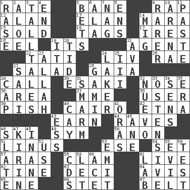 ACROSS 1. Pace 5. Object of repulsion 9. Strike 12. ____ Jay Lerner 13. Liveliness 14. Hindu Mythology: god of death 15. Exchanged or delivered for money 16. Labels 17. Angers 18. Snakelike fish 19. It is 21. Rep 22. Jacques of French films 24. 54 in ancient Rome 26. Actress Charlotte 27. First course 28. Greek goddess of the earth (variant) 29. Give a ring to 30. 1973 Nobel Price Winner (Physics) Leo 32. Sense of smell 36. Type of rug 37. Madame (abbr.) 38. One who uses or employs something 39. Expression of disdain 40. Capital of Egypt 42. Inactive volcano in Sicily 43. Merit 44. All-night dance parties 46. What Jean-Claude Killy likes to do 49. Symbol (abbr.) 50. At once, immediately (arch.) 51. "_ and Lucy" (Charlie Brown theme song) 53. Compass dir. 54. Put into a specified state 57. Ancient river in northeast Turkey 58. Burrowing marine mollusk 61. Moving, as bait 62. Prong on a fork 63. Tenth: prefix 64. Advice 65. Compass dir. 66. Proofreading order 67. Waist strap DOWN 1. Raze (variant) 2. Medicinal plant 3. Baron Munchausen's specialties 4. Conclude 5. Stakes 6. In the manner of 7. Tired old horse 8. Followers of ems 9. More valued for its uncommonness 10. Sports stadium 11. Thick mixture 14. Russian fighter aircraft 19. Call ___ day 20. Event that recurs at intervals 21. Actress Gardner 23. Assad's deity 24. Member of a famous L.A. basketball team 25. One more than two 27. Indian skirt 28. Homeless child 29. Head covering 31. Excessive but superficial compliments 32. New (sp.) 33. Clearly or manifestly demonstrative 34. Elected reps. 35. Epoch 40. Island 41. Mouths or openings 43. Double-curved letter 45. One (Scot) 46. Schedule 47. Japanese brewing company 48. Silly 52. Purpose 53. Give off 55. Tending to cause great harm 56. Trial 58. Music discs 59. Allow 60. Adept person 61. Experiment locale