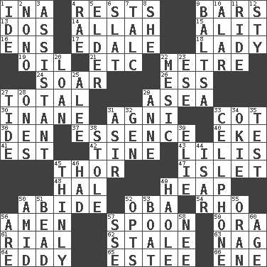 ACROSS 1. _ tizzy (2 wds.) 4. Musical pauses 9. Long, evenly shaped pieces 13. Two (Sp.) 14. Assad's deity 15. Came down and settled, as after flight 16. Followers of ems 17. Peak District village in England 18. Kenny Rogers chart-topper in '80 19. Petroleum 21. And so on (abbr.) 22. Distance measurement (Brit.) 24. Fly high 26. Curvy letter 27. Add up to 29. Toward the sea 30. Silly 31. Hindu god of fire 33. Small bed 36. Lair 37. Core 40. Supplement with great effort 41. Eastern Standard Time (abbr.) 42. Prong on a fork 43. Ms. Damita and namesakes 45. Son of Odin 47. Small island 48. Actor Linden 49. Pile 50. Tolerate 52. Chief or king in Benin or Nigeria 54. 17th letter of the Greek alphabet 56. So be it 57. Soup utensil 59. Mouth or opening 61. Monetary unit of Yemen 62. Having lost freshness 63. Tired old horse 64. Whirlpool 65. First name in cosmetics 66. Compass dir. DOWN 1. Binary compound 2. Words to Nanette 3. Helper 4. Actress Charlotte 5. A person who is older than you are 6. Narrow board 7. Baby powder 8. A female animal or person 9. Greek mezzo-soprano Agnes 10. Having or resembling wings 11. Travel on an animal 12. Filthy place 20. Grant temporary use of 22. Of or pertaining to a meson 23. Compass dir. 25. Toward shelter 27. Event that recurs at intervals 28. Singles 29. Singer Murray 31. SW Saudi Arabia district 32. Commissioned mil. rank 33. Portable communications device 34. Migrant worker of the '30s 35. Trial 38. Fur scarf 39. Writer Wiesel 44. Austrian river, tributary to the Danube 45. Without force or sincere effort 46. Possessed 49. White Person, in Hawaii 50. Among 51. Necklace unit 52. Elects 53. Water vessel 55. NW Algerian seaport 56. "We ___ not amused" (Victoria) 57. Compass dir. 58. Born 60. Grow older